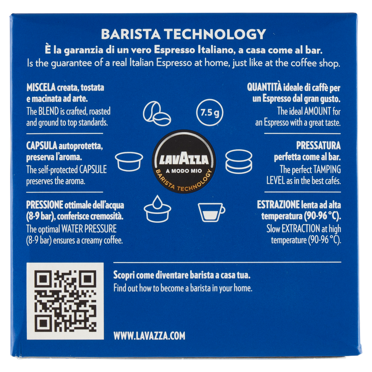 Barista technology È la garanzia di un vero Espresso Italiano, a casa come al bar. Miscela creata, tostata e macinata ad arte. Capsula autoprotetta, preserva l'aroma. Pressione ottimale dell'acqua (8-9 bar), conferisce cremosità. Quantità ideale di caffè per un Espresso dal gran gusto. Pressatura perfetta come al bar. Estrazione lenta ad alta temperatura (90-96 °C). Scopri come diventare barista a casa tua. www.lavazza.com