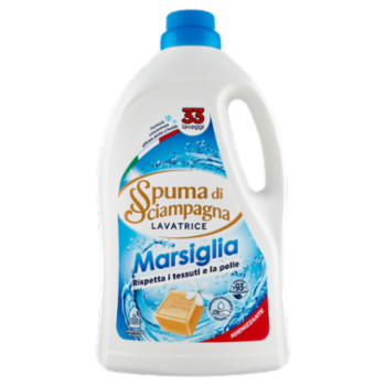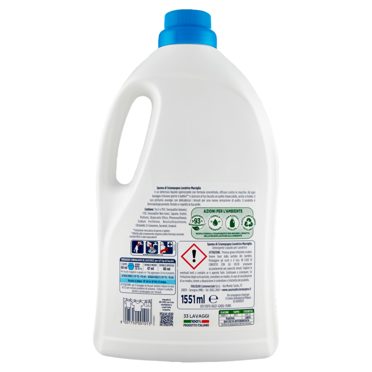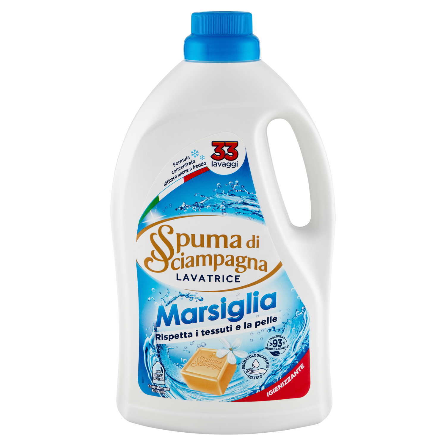 Spuma di Sciampagna Lavatrice Marsiglia è un detersivo liquido igienizzante con formula concentrata, efficace contro le macchie. Ad ogni lavaggio rimuove germi e batteri** e assicura al tuo bucato un pulito impeccabile, anche a freddo. Il suo profumo avvolge con delicatezza i tessuti per una nuova sensazione di pulito. Il prodotto è Dermatologicamente Testato e rispetta la tua pelle. **rimozione meccanica di germi e batteri Azioni per l'ambiente >93% Ingredienti biodegradabili* Formula concentrata Con plastica riciclata Nuova formula trasparente per ridurre l'impatto delle microplastiche sull'ambiente * Riferito alla componente organica della formula secondo metodi OECD o dati equivalenti