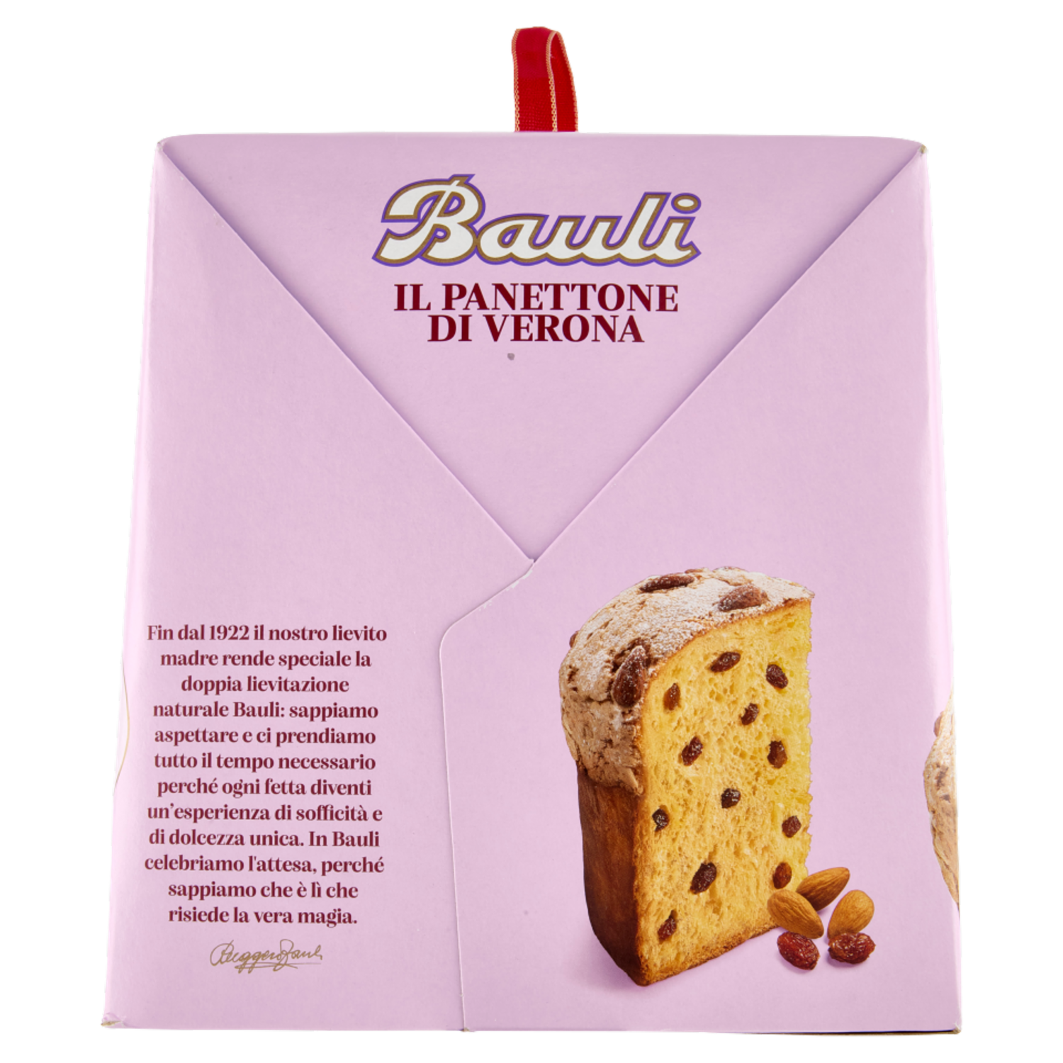 Zero canditi, ricco di uvetta e glassa con mandorle e zucchero a velo Basta poco per assaporare il Natale e condividere insieme la magia delle feste: il Panettone Bauli accende il Natale. La Ricetta Veronese "Ho dato una svolta al gusto della tradizione: il Panettone di Verona è la mia rivoluzione. Ricco in morbida uvetta, ricoperto di glassa e mandorle croccanti, la mia ricetta veronese profuma di vaniglia e incarna la passione per la mia città." Ruggero Bauli