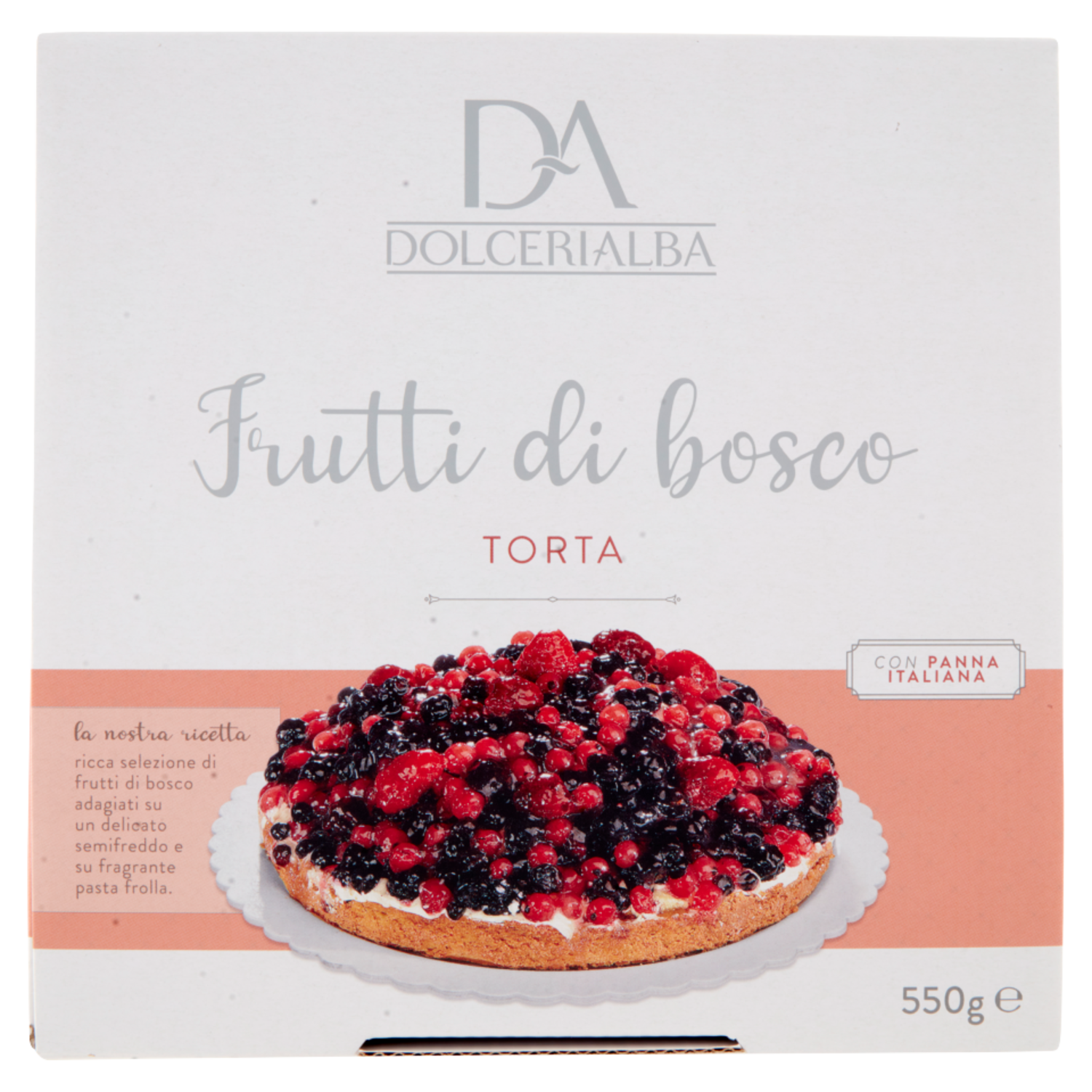 Selezione di frutti di bosco adagiati su un delicato semifreddo e su fragrante pasta frolla. Prodotto congelato