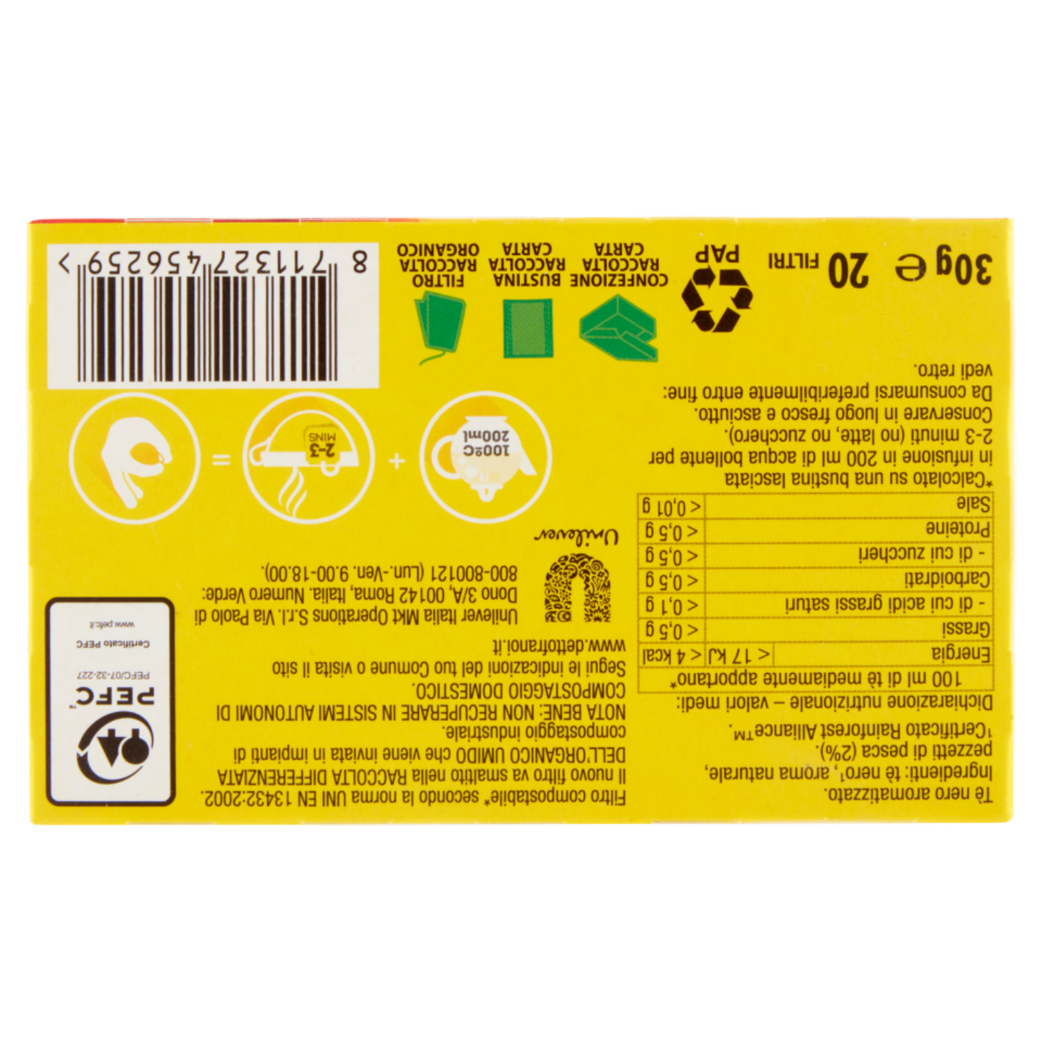 *Calcolato su una bustina lasciata in infusione in 200 ml di acqua bollente per 2-3 minuti (no latte, no zucchero) |