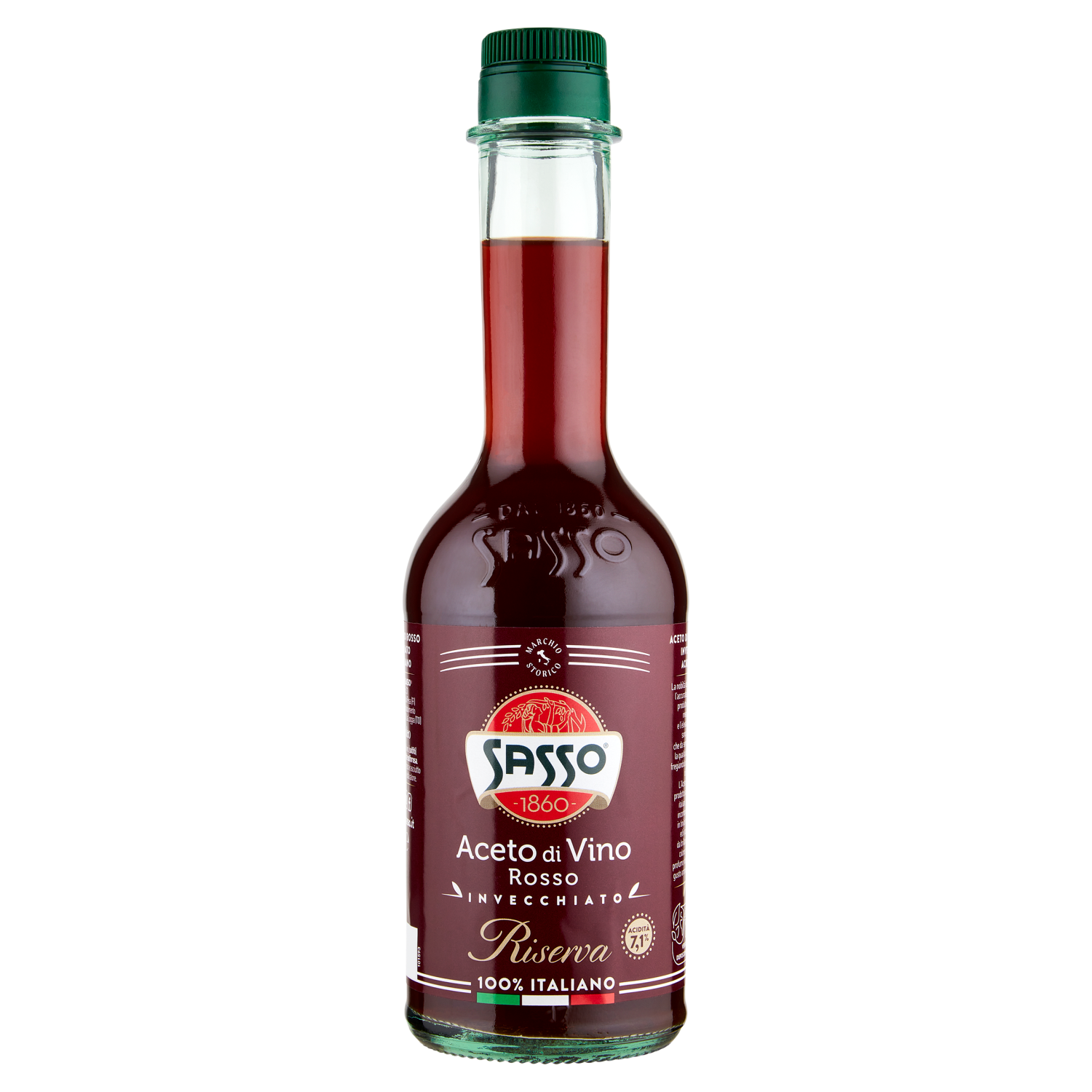 La nobiltà dei vini da cui deriva, l'accuratezza del processo produttivo, il prolungato invecchiamento e l'elevata acidità (7,1%) sono gli elementi che da sempre garantiscono la qualità dell'Aceto Sasso, fregiandolo del riconoscimento di Riserva. L'Aceto Rosso Sasso, prodotto solo con vini 100% italiani, matura il suo inconfondibile bouquet in tini di rovere e larice ed è caratterizzato da brillante limpidezza, colore rosso rubino, profumo intenso e armonico, gusto aromatico e vellutato.