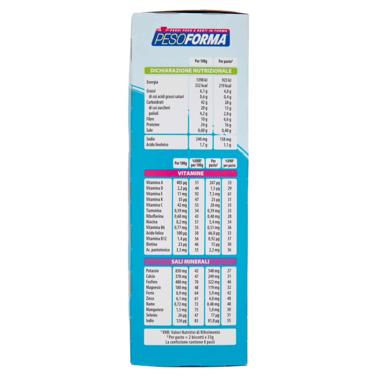 il Tuo Pesoforma sostituisci il pasto con 2 golosi biscotti** Pesoforma consiglia di consumare il pasto bevendo molta acqua. Attento al tuo benessere 13 vitamine* 11 minerali* Senza edulcoranti, coloranti e conservanti Pesoforma si impegna a migliorare costantemente le proprie ricette: con fibre e con meno zuccheri, per prodotti più sani. Scopri di più sul sito pesoforma.com Alleato della tua linea Ricco in proteine* 28% dell'energia Ricco in fibre 219 kcal per pasto Perdita e mantenimento del peso* Fonte: EFSA (European Food Safety Authority) **Scegli uno stile di vita sano: mangia in modo vario ed equilibrato, bevi almeno due litri di acqua al giorno e pratica regolarmente attività fisica, ti sentirai più in forma. Per perdere peso, sostituisci due pasti principali al giorno con Pesoforma; per mantenere il peso sostituisci un pasto al giorno, nell'ambito di una dieta ipocalorica che comprenda anche altri alimenti. Ti consigliamo di chiedere un parere medico se desideri consumare il prodotto per più di tre settimane consecutive. *Valido per i sostituti del pasto per il controllo del peso