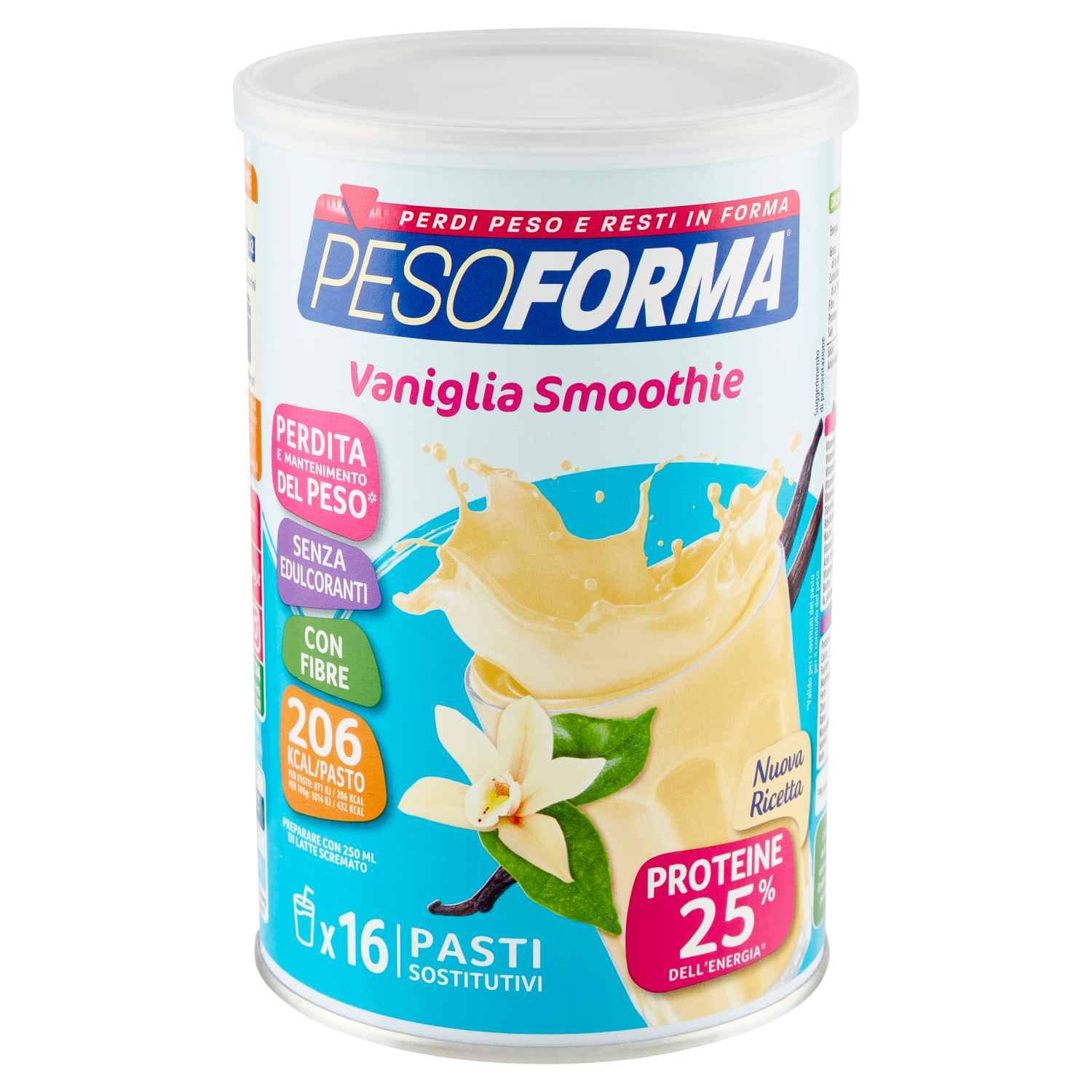 il Tuo Pesoforma sostituisci il pasto con un goloso Smoothie** Pesoforma consiglia di bere almeno 2 litri di acqua durante la giornata. Alleato della tua linea Ricco in proteine* 25% dell'energia Con fibre 206 kcal per pasto Attento al tuo benessere 13 vitamine* 11 minerali* Senza edulcoranti e conservanti Pesoforma si impegna a migliorare costantemente le proprie ricette: con fibre e con meno zuccheri, per prodotti più sani. Scopri di più sul sito pesoforma.com Perdita e mantenimento del peso* Fonte: EFSA (European Food Safety Authority) **Scegli uno stile di vita sano: mangia in modo vario ed equilibrato, bevi almeno due litri di acqua al giorno e pratica regolarmente attività fisica, ti sentirai più in forma. Per perdere peso, sostituisci due pasti principali al giorno con Pesoforma; per mantenere il peso sostituisci un pasto al giorno, nell'ambito di una dieta ipocalorica che comprenda anche altri alimenti. Ti consigliamo di chiedere un parere medico se desideri consumare il prodotto per più di tre settimane consecutive. *Valido per i sostituti del pasto per il controllo del peso