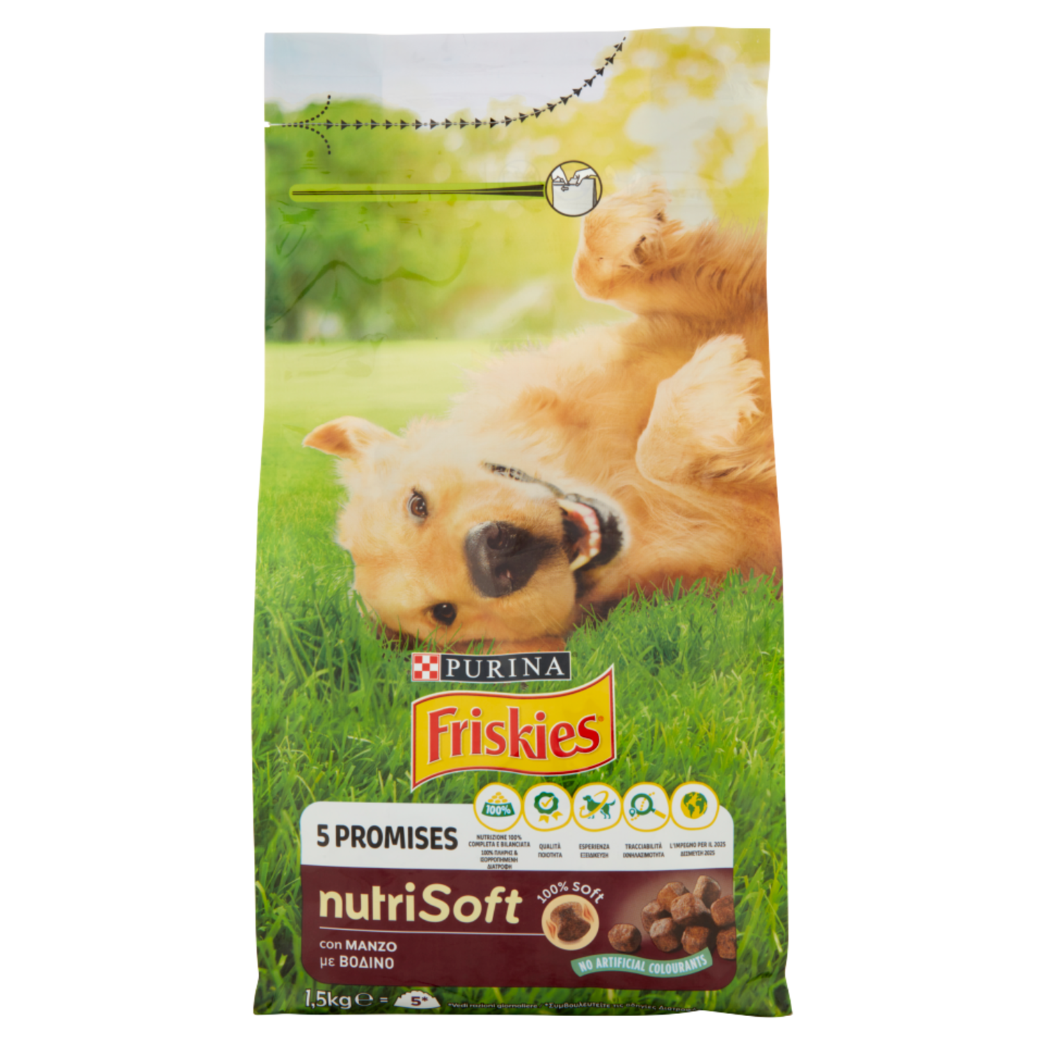 nutriSoft - 100% soft* PURINA FRISKIES Nutri Soft è un alimento per cani 100% completo e bilanciato, preparato con gustosi bocconi con manzo. * morbidezza variabile nel tempo - Favorisce un pelo lucido ed una cute sana - Favorisce occhi vivaci, segno di vitalità - Vitamine A, D & E - Feci solide grazie ad una digestione sana No coloranti, aromatizzanti o conservanti artificiali - 5 Promises - Nutrizione 100% completa e bilanciata - Qualità - Esperienza - Tracciabilità - L'impegno per il 2025 - 100% Soft - No artificial colourants - 1,5kg ℮ = 5 ciotole* - * Vedi razioni giornaliere