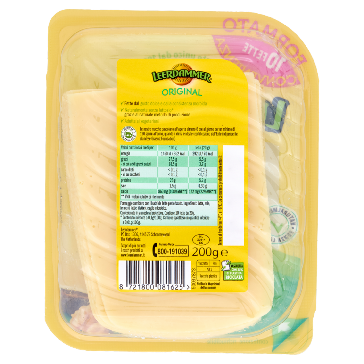 - Fette dal gusto dolce e dalla consistenza morbida - Naturalmente senza lattosio* grazie al naturale metodo di produzione - Adatte ai vegetariani *Contenuto inferiore a 0,1g/100g. Contiene galattosio in quantità inferiore a 0,01g/100g. Mucche al pascolo Prodotto da 100% latte olandese da mucche che pascolano all'aperto almeno 6 ore al giorno per un minimo di 120 giorni all'anno, quando il clima è ideale (certificazione dall'Ente indipendente olandese Grazing Foundation)
