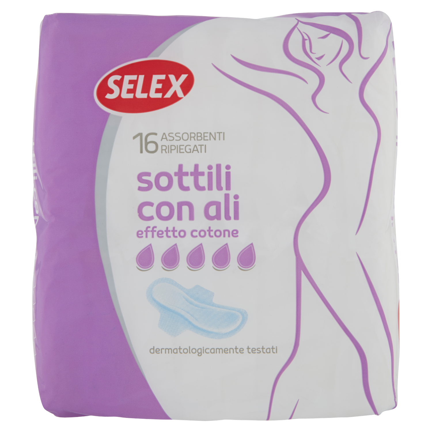 Selex Sottile con Ali per flussi normali e abbondanti è realizzato con una particolare miscela di cellulosa e materiale superassorbente, per una piacevole sensazione di asciutto.