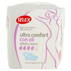 Selex Ultra Comfort con Ali per tutti i giorni del ciclo in soli 2 mm di spessore garantisce assorbenza e comfort. Le comode ali ed il filtrante in tessuto non tessuto offrono protezione e igienicità.