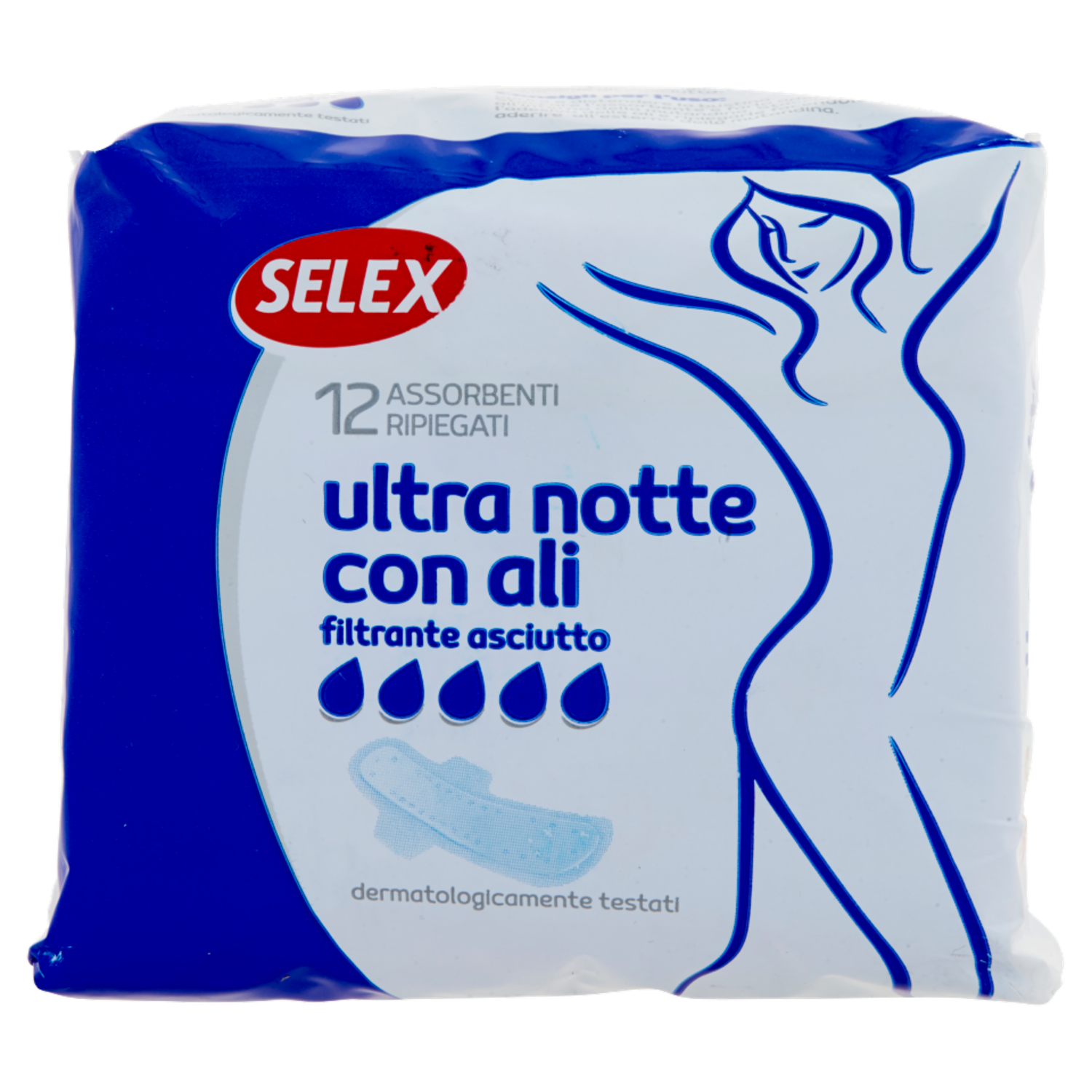 Selex Ultra Notte più lungo per flussi abbondanti In soli 2 mm di spessore garantisce assorbenza e comfort. Grazie alla forma allungata è ideale per i flussi particolarmente abbondanti e per la protezione notturna. Le comode ali ed il filtrante perforato offrono protezione, igiene e sensazione di asciutto.