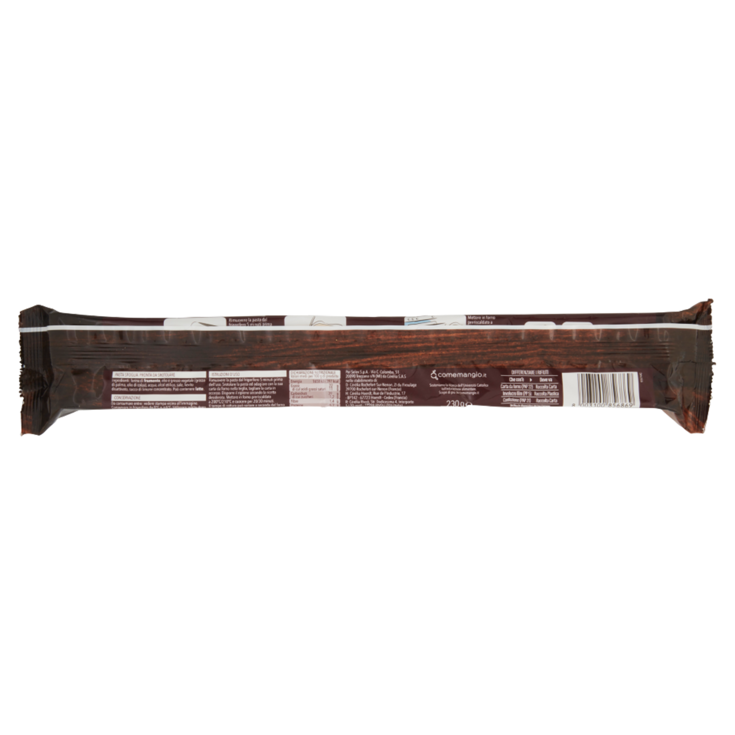 Istruzioni d'uso Rimuovere la pasta dal frigorifero 5 minuti prima dell'uso. Srotolare la pasta ed adagiare con la sua carta da forno nella teglia, tagliare la carta in eccesso. Disporre il ripieno secondo la ricetta desiderata. Mettere in forno preriscaldato a 200°C/210°C e cuocere per 20/30 minuti. Il tempo di cottura può variare a seconda del forno e del ripieno impiegato.