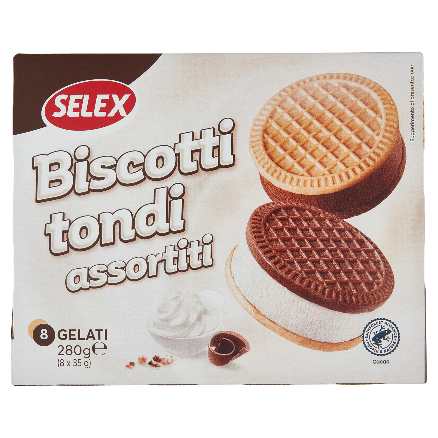 8 Gelati con biscotti al cacao magro e al malto: 4 al gusto di vaniglia e 4 al cioccolato Biscotto al gusto di vaniglia Biscotto al cioccolato
