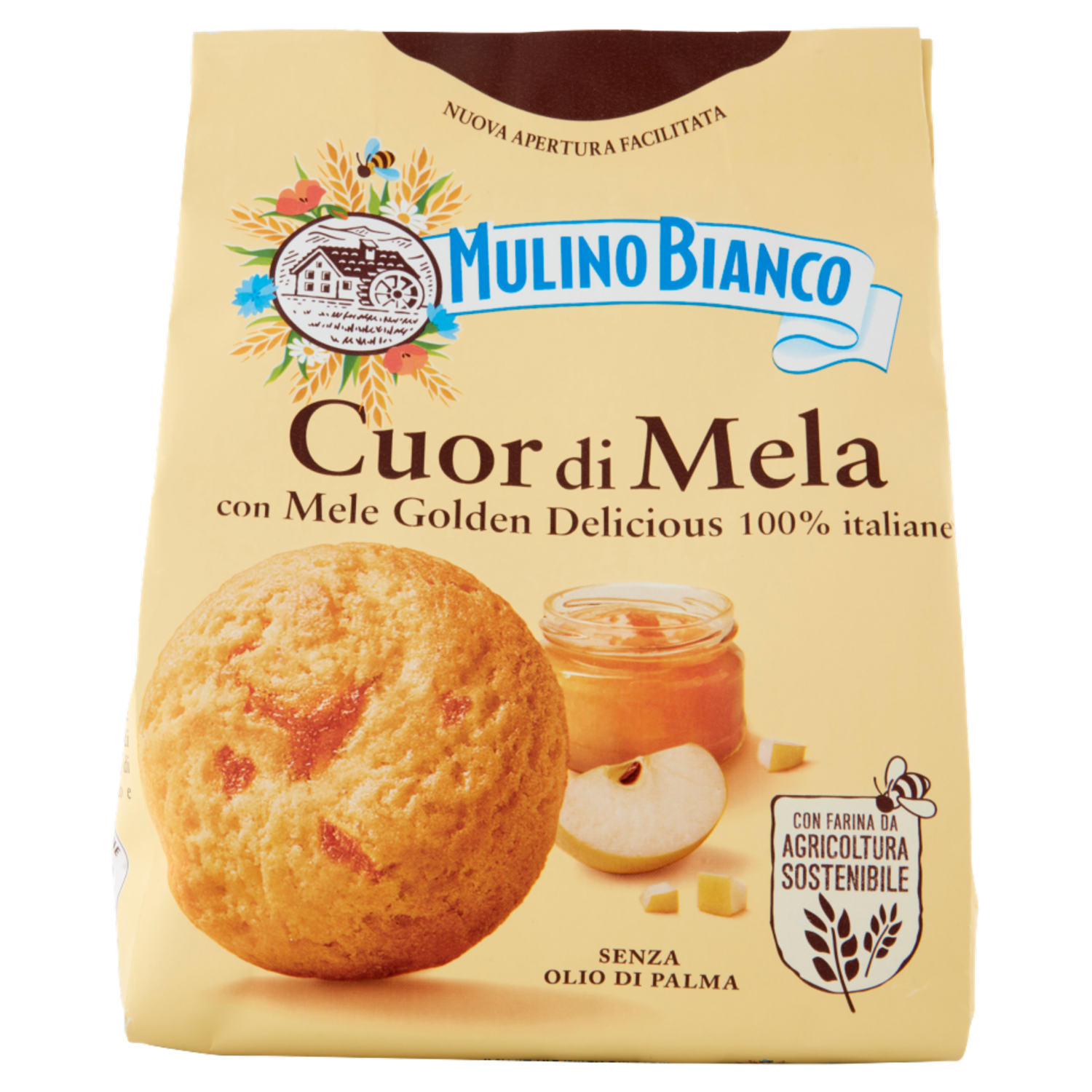 Riciclami nella carta Le confezioni dei Cuor di Mela sono fatte con carta proveniente da fonti certificate e hanno una nuova apertura facilitata. Aiutaci a rispettare l'ambiente: ricicla questa confezione nella carta. Il 100% delle confezioni Mulino Bianco è riciclabile. Scopri di più su mulinobianco.it/confezioni La Carta del Mulino Con farina da agricoltura sostenibile Ogni Cuor di Mela di questa confezione è fatto con farina di grano tenero da Agricoltura Sostenibile rispettando le 10 regole della Carta del Mulino. La Carta del Mulino è il nostro disciplinare per la coltivazione sostenibile del grano tenero redatto insieme al WWF. Porta qualità nei prodotti, supporta il lavoro della comunità di agricoltori e protegge la biodiversità favorendo anche gli insetti impollinatori. Insieme per un grano tenero sostenibile La Carta del Mulino prevede il rispetto dei criteri di sostenibilità ISCC Plus ed è stata scritta insieme al WWF e al Dipartimento di Scienze e Tecnologie Agro-Alimentari dell'Alma Mater Studiorum - Università di Bologna. Scopri di più su mulinobianco.it/lacartadelmulino Il buono che non vedi Tutti i nostri biscotti sono senza grassi idrogenati e senza coloranti. Sono inoltre preparati senza l'uso di conservanti. Si raccomandata di tenerli in un luogo fresco e asciutto.