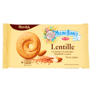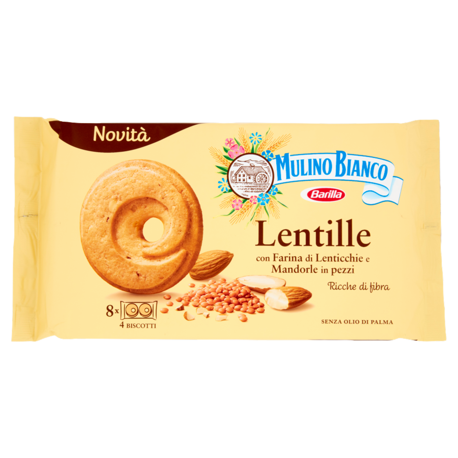 Tutto il buono che senti - Farina di lenticchie - Mandorle in pezzi C'è un gusto nuovo a colazione: scopri il primo frollino Mulino Bianco con tutta la bontà delle mandorle e un ingrediente speciale, la farina di legumi! Le nuove Lentille sono sapientemente preparate con la farina di lenticchie rosse, il cui aroma delicato incontra tutta la croccantezza delle mandorle per un biscotto ricco di fibre e dal gusto che ti sorprenderà. Il buono che non vedi - Il nostro Mulino ama la natura. Ecco perché dal 2008 ad oggi, grazie in particolare all'acquisto di energia elettrica da fonte rinnovabile abbiamo ridotto le emissioni di gas serra dei nostri stabilimenti di oltre il 50%. - Tutti i nostri biscotti sono senza grassi idrogenati e senza coloranti. Sono inoltre preparati senza l'utilizzo di conservanti. Si raccomanda di tenerli in un luogo fresco e asciutto. www.mulinobianco.it