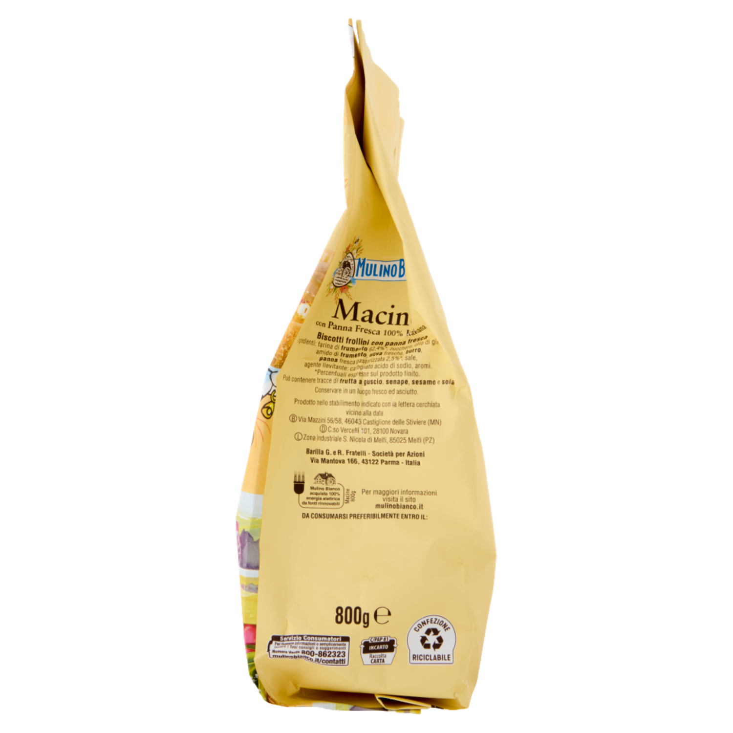 Nuove Macine Lo sapevi che le Macine hanno una nuova ricetta? Una colazione all'insegna del gusto e dell'inzuppo perfetto, con uno dei biscotti più iconici di sempre: da oggi con più panna da latte fresco 100% italiano. Per chi ama inzuppare, la colazione Mulino Bianco è firmata Macine. La Carta del Mulino Con farina da agricoltura sostenibile Ogni Macina di questa confezione è fatta con farina di grano tenero da Agricoltura Sostenibile rispettando le 10 regole della Carta del Mulino. La Carta del Mulino è il nostro disciplinare per la coltivazione sostenibile del grano tenero redatto insieme al WWF. Porta qualità nei prodotti, supporta il lavoro della comunità di agricoltori e protegge la biodiversità favorendo anche gli insetti impollinatori. Insieme per un grano tenero sostenibile La Carta del Mulino prevede il rispetto dei criteri di sostenibilità ISCC Plus ed è stata scritta insieme al WWF e al Dipartimento di Scienze e Tecnologie Agro-Alimentari dell'Alma Mater Studiorum - Università di Bologna. Scopri di più su mulinobianco.it/lacartadelmulino Il buono che non vedi - Questa confezione mantiene intatta la fragranza ed è interamente riciclabile nella carta. - Tutti i nostri biscotti sono senza grassi idrogenati e senza coloranti. Sono inoltre preparati senza l'utilizzo di conservanti. Si raccomanda di tenerli in un luogo fresco e asciutto.