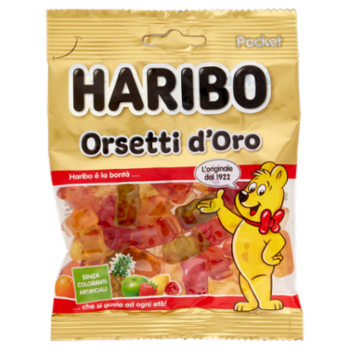 Cari Fans Haribo, Ingredienti accuratamente selezionati e una ricetta che viene costantemente migliorata da più di 90 anni fanno degli Orsetti D'Oro un piacere unico. In tutto il mondo gli Orsetti D'Oro, così come gli altri prodotti Haribo, sono apprezzati da generazioni. Adulti e bambini si fidano del marchio Haribo e amano gli Orsetti D'Oro. Siamo legati a questa missione e alla tradizione dei Creatori degli Orsetti D'Oro - Dr. Hans Riegel e Paul Riegel - poichè la nostra filosofia è "Haribo è la bontà che si gusta ad ogni età". Il vostro Team Haribo Fragola, Arancia, Mela, Lampone, Limone, Ananas