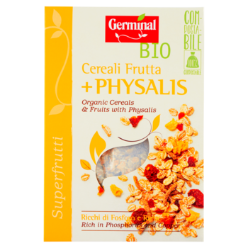 Proprietà di fosforo e rame La ricca miscela di cereali e frutta rende questo prodotto una fonte naturale di fosforo e rame, minerali essenziali per il nostro benessere perché coinvolti in numerose funzioni del nostro organismo. Fosforo e rame contribuiscono al normale metabolismo energetico. Provami con Cereali Frutta + Physalis: a colazione, nel latte o nello yogurt, sono un ottimo modo di iniziare la giornata, ma la loro golosità li rende perfetti anche da consumare puri, per una pausa in ufficio o come snack invitante in ogni momento della giornata. Scopri di più su: www.germinalbio.it "Ricorda l'importanza di una dieta varia ed equilibrata, nel quadro di uno stile di vita sano."