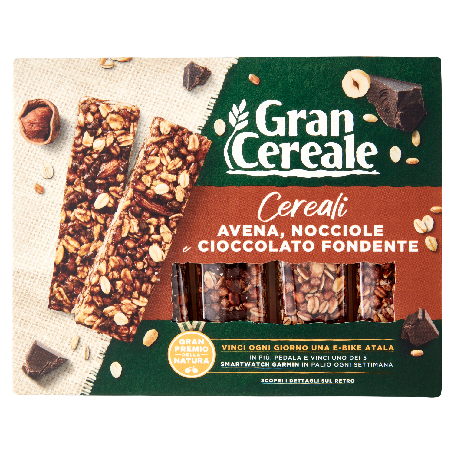 Barretta di cereali con avena, frumento integrale, nocciole e cioccolato fondente