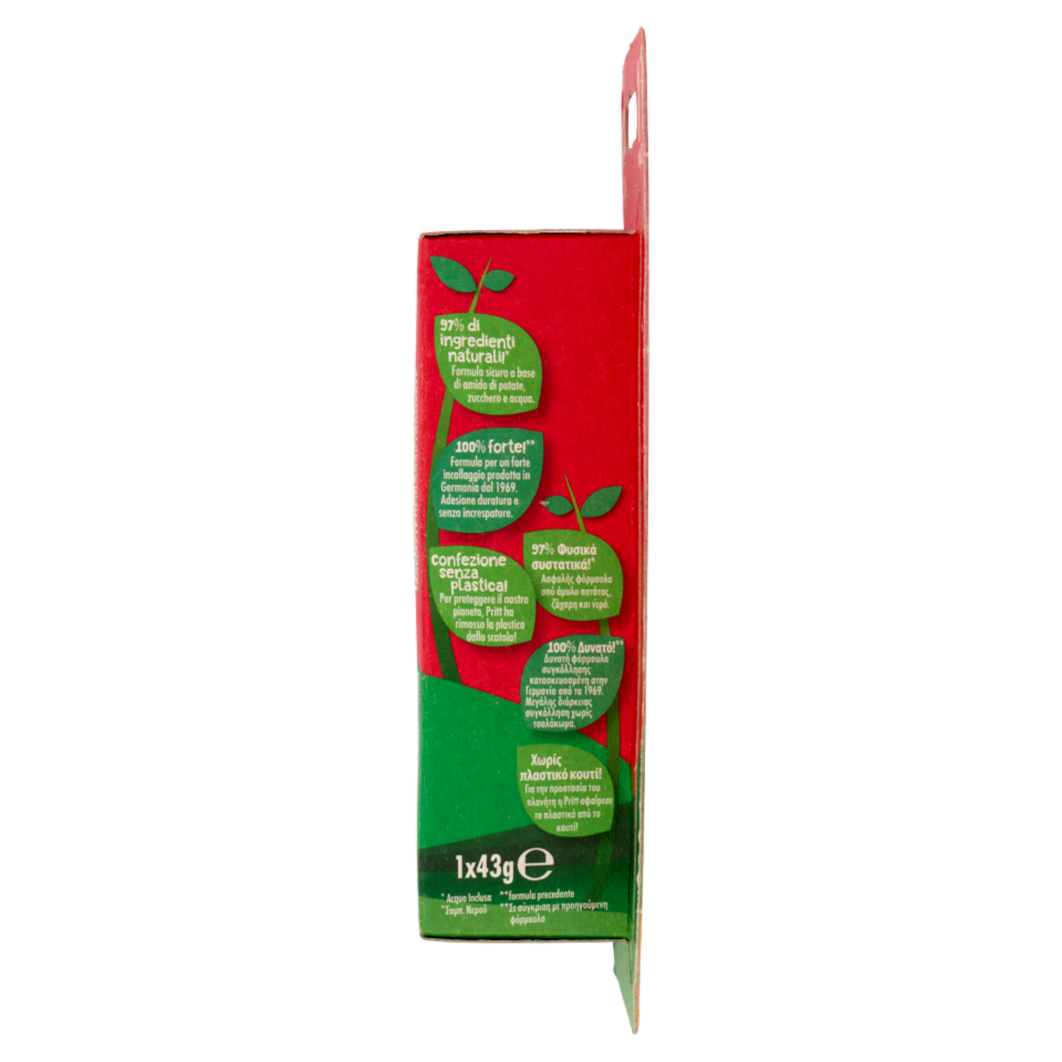 Colla trasparente, facile e sicura per carta, cartone e foto, senza solventi e lavabile a 20°C. 97% di ingredienti naturali!* Formula sicura a base di amido di patate, zucchero e acqua. 100% forte!** Formula per un forte incollaggio prodotta in Germania dal 1969. Adesione duratura e senza increspature. Confezione senza plastica! Per proteggere il nostro pianeta, Pritt ha rimosso la plastica dalla scatola! Acqua inclusa * Acqua Inclusa **formula precedente