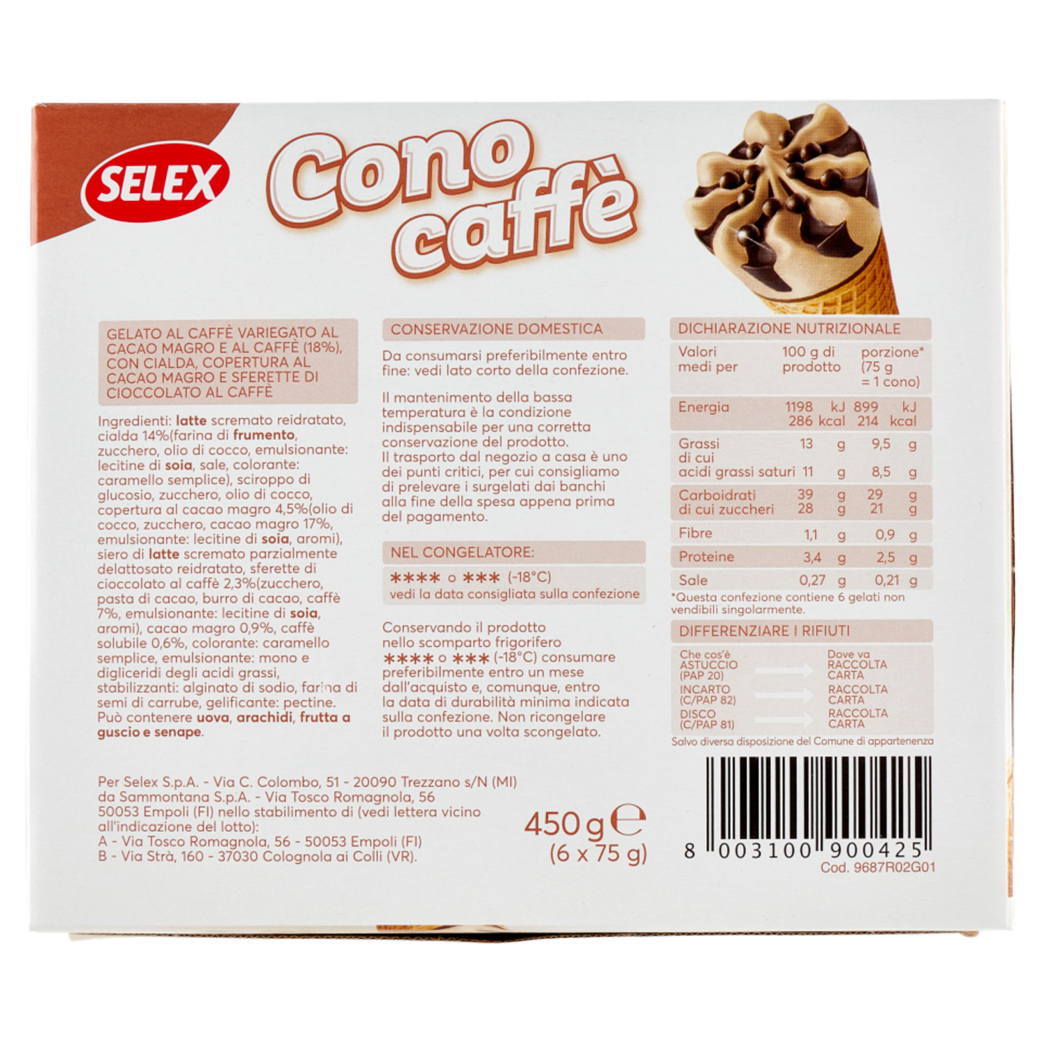Gelato al caffè variegato al cacao magro e al caffè (18%), con cialda, copertura al cacao magro e sferette di cioccolato al caffè