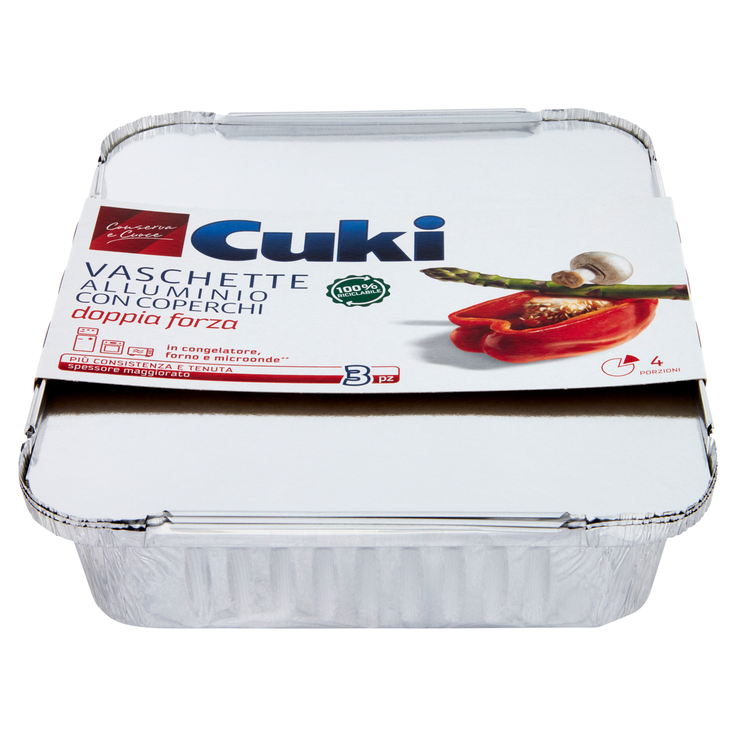 Caratteristiche Cuki Vaschette Alluminio Doppia Forza sono realizzate in alluminio a spessore maggiorato per offrirti un'elevata consistenza e tenuta. Ti permettono inoltre di ottenere una cottura ottimale, più veloce e omogenea, poiché l'alluminio è un ottimo conduttore di calore. Cuki Vaschette Alluminio con Coperchi sono provviste di apposito coperchio di chiusura e sono indicate per la cottura nel forno tradizionale e nel microonde, per la conservazione dei tuoi cibi nel frigorifero o nel congelatore, per lo scongelamento e il successivo riscaldamento, per l'asporto. Durante la congelazione Cuki Vaschette Alluminio con Coperchi proteggono i cibi dal disseccamento per disidratazione, dall'irrancidimento dei grassi per l'azione dell'aria e evitano la trasmissione degli odori tra un cibo e l'altro. I pratici coperchi, facili da utilizzare, permettono la sovrapposizione, così da sfruttare con ordine lo spazio nel congelatore.