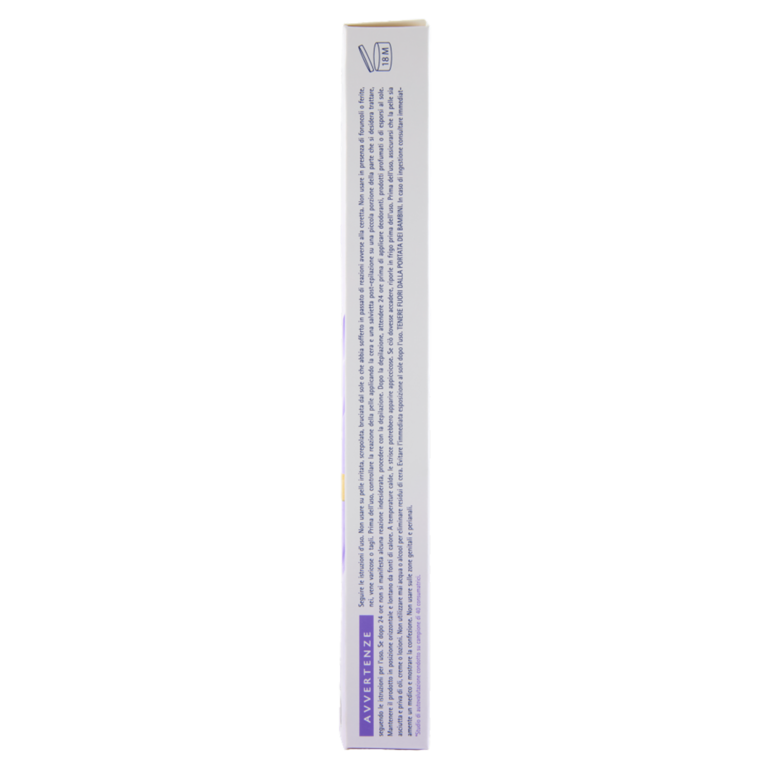 AVVERTENZE Seguire le istruzioni d'uso. Non usare su pelle irritata, screpolata, bruciata dal sole o che abbia sofferto in passato di reazioni avverse alla ceretta. Non usare in presenza di foruncoli o ferite, nei, vene varicose o tagli. Prima dell'uso, controllare la reazione della pelle applicando la cera e una salvietta post-epilazione su una piccola porzione della parte che si desidera trattare, seguendo le istruzioni per l'uso. Se dopo 24 ore non si manifesta alcuna reazione indesiderata, procedere con la depilazione. Dopo la depilazione, attendere 24 ore prima di applicare deodoranti, prodotti profumati o di esporsi al sole. Mantenere il prodotto in posizione orizzontale e lontano da fonti di calore. A temperature calde, le strisce potrebbero apparire appiccicose. Se ciò dovesse accadere, riporle in frigo prima dell'uso. Prima dell'uso, assicurarsi che la pelle sia asciutta e priva di oli, creme o lozioni. Non utilizzare mai acqua o alcool per eliminare residui di cera. Evitare l'immediata esposizione al sole dopo l'uso. TENERE FUORI DALLA PORTATA DEI BAMBINI. In caso di ingestione consultare immediatamente un medico e mostrare la confezione. Non usare sulle zone genitali e perianali.