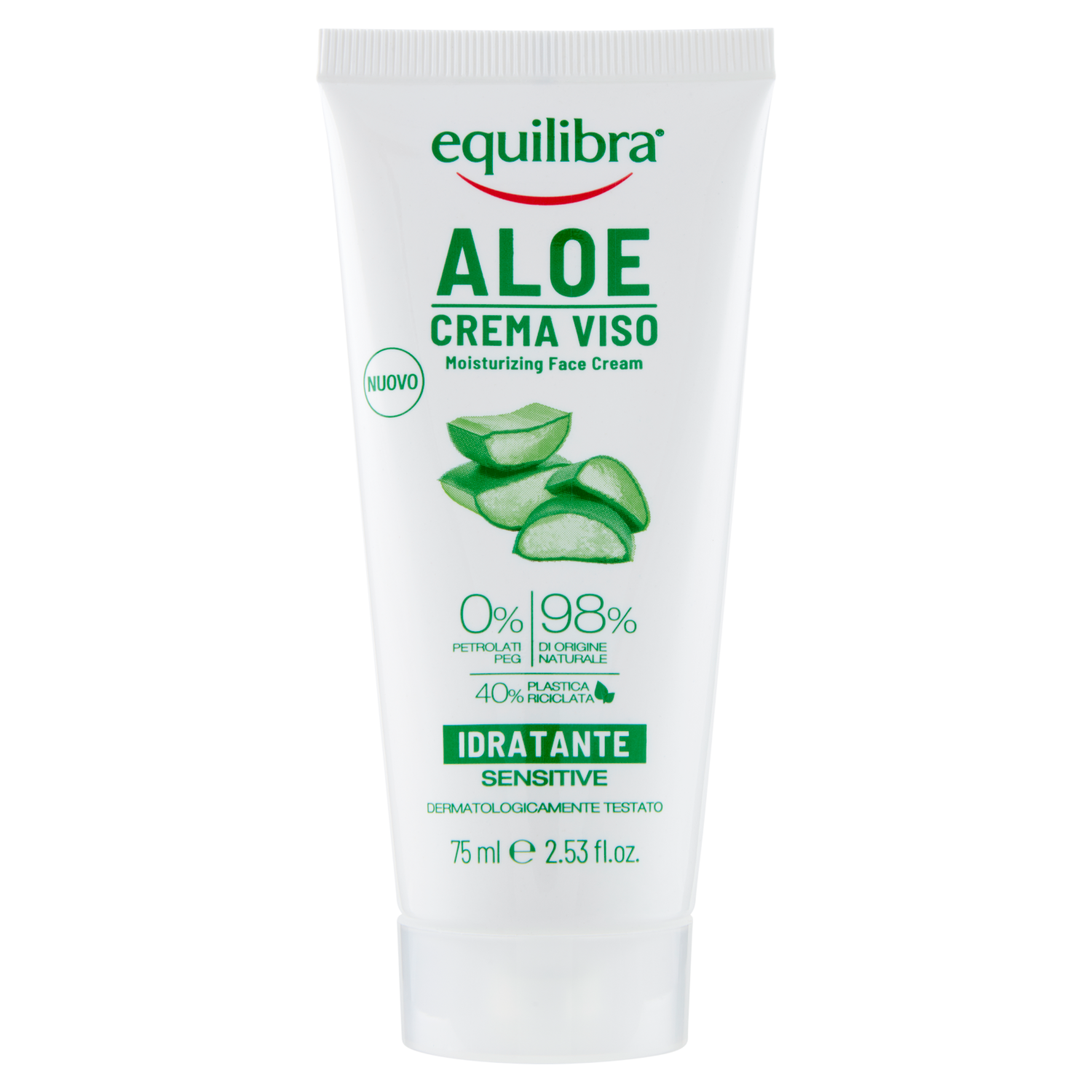 Equilibra Aloe Crema Viso Idratante è una crema contenente un'elevata quantità di Aloe Vera (40%) ad azione idratante e lenitiva. Priva di profumazione aggiunta, si assorbe velocemente senza ungere. Formulata con componenti vegetali selezionati, priva di paraffina e di oli minerali, idrata e protegge con delicatezza la pelle del viso. Cosa contiene: Olio di Mandorle Dolci: mantiene l'idratazione; Vitamina E: antiossidante; Olio di Rosa Mosqueta: idratante e antiaging; Burro di Karité: nutriente. L'Aloe Vera Equilibra, contenuta in importanti quantità (40%) idrata, protegge e riequilibra la pelle del viso. Sensitive Tutta la delicatezza dell'Aloe, ricca in polisaccaridi, per il rispetto delle pelli più sensibili. Senza: parabeni - petrolati - siliconi - PEG - profumazione aggiunta Adatta a pelli sensibili Dermatologicamente testato Made in Italy - Prodotto in Italia 98% Ingredienti naturali Senza: parabeni - petrolati
