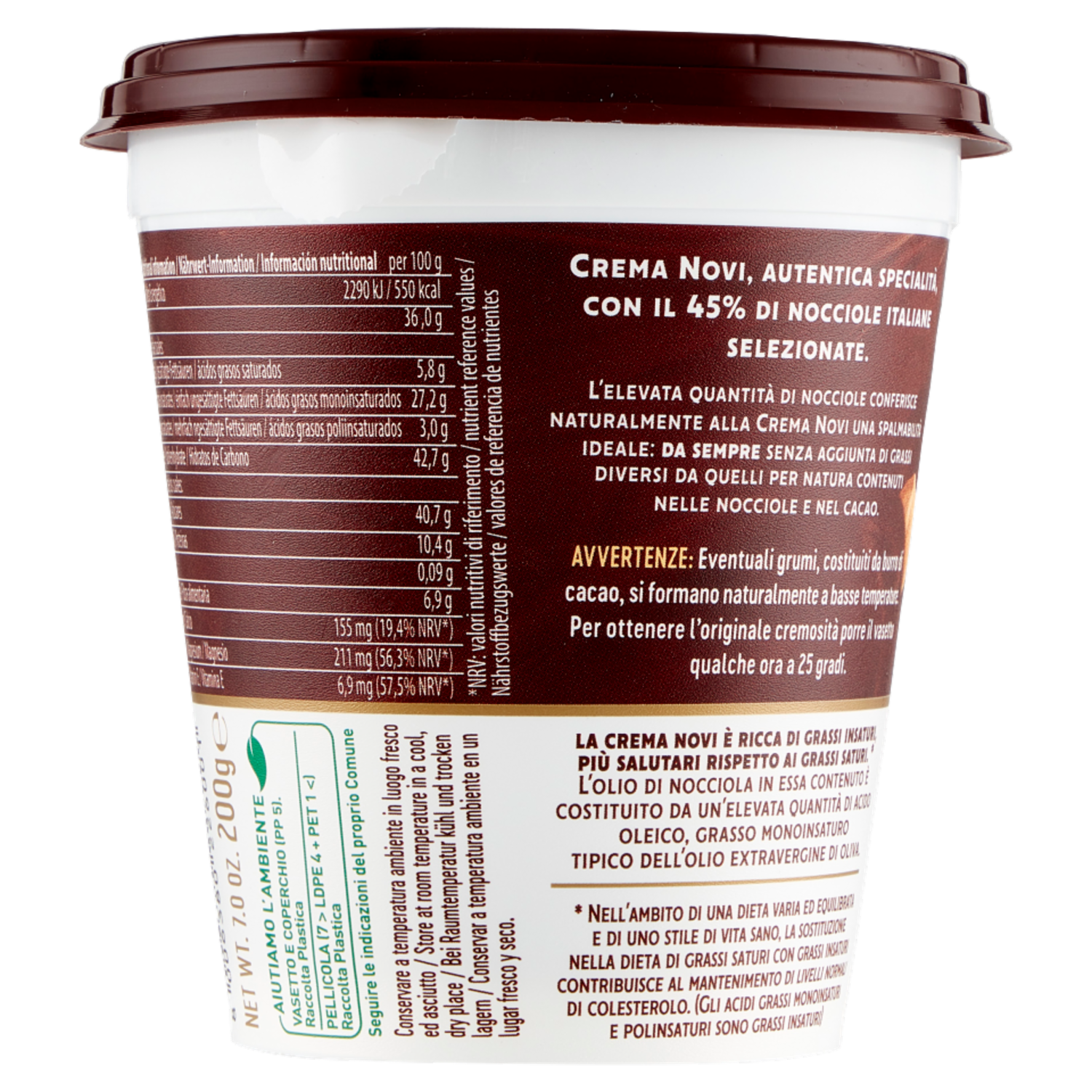 Crema Novi, autentica specialità, con il 45% di nocciole italiane selezionate. L'elevata quantità di nocciole conferisce naturalmente alla Crema Novi una spalmabilità ideale: da sempre senza aggiunta di grassi diversi da quelli per natura contenuti nelle nocciole e nel cacao. La Crema Novi è ricca di grassi insaturi, più salutari rispetto ai grassi saturi. * L'olio di nocciola in essa contenuto è costituito da un'elevata quantità di acido oleico, grasso monoinsaturo tipico dell'olio extravergine di oliva. * Nell'ambito di una dieta varia ed equilibrata e di uno stile di vita sano, la sostituzione nella dieta di grassi saturi con grassi insaturi contribuisce al mantenimento di livelli normali di colesterolo. (Gli acidi grassi monoinsaturi e polinsaturi sono grassi insaturi) Senza glutine