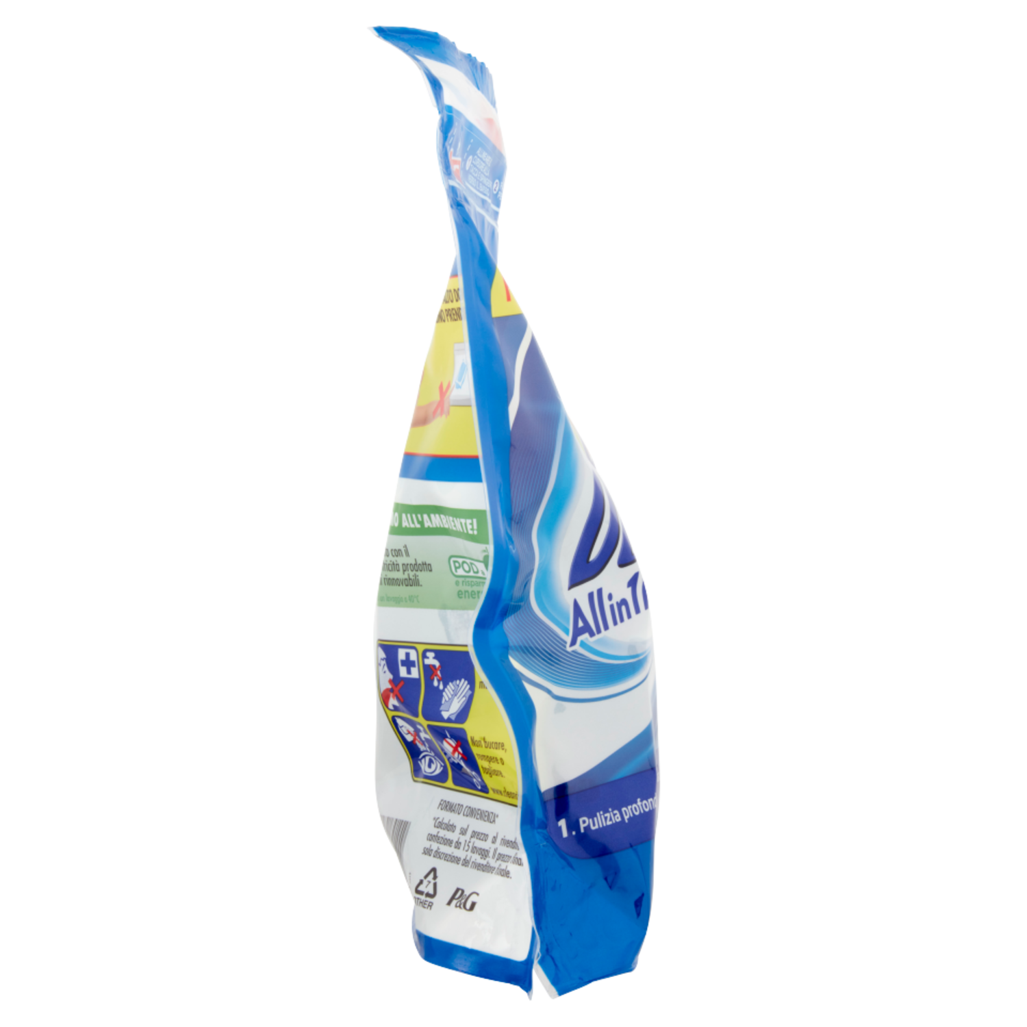 Detersivo per bucato. Pericolo. Provoca gravi lesioni oculari. Provoca irritazione cutanea. Nocivo per gli organismi acquatici con effetti di lunga durata. Tenere fuori dalla portata dei bambini. IN CASO DI CONTATTO CON GLI OCCHI: sciacquare accuratamente per parecchi minuti. IN CASO DI CONTATTO CON LA PELLE: lavare abbondantemente con acqua. IN CASO DI INGESTIONE: sciacquare la bocca. NON provocare il vomito. Contattare immediatamente un CENTRO ANTIVELENI/un medico. Smaltire il prodotto/recipiente in accordo con le regolamentazioni locali. Contiene MEA-C10-13 Alkyl Benzenesulfonate, MEA-Laureth Sulfate, C12-14 Pareth-n. Contiene Delta-Damascone, Tetramethyl Acetyloctahydronaphthalenes, Isoeugenol, Butylphenyl methylpropional, Hydroxyisohexyl 3-cyclohexene carboxaldehyde. Può provocare una reazione allergica. METTILA IN UN POSTO IN ALTO DOVE I BAMBINI NON POSSONO PRENDERLA Usare con le mani asciutte. Non bucare, rompere o tagliare. A.I.S.E. www.cleanright.eu www.keepcapsfromkids.eu