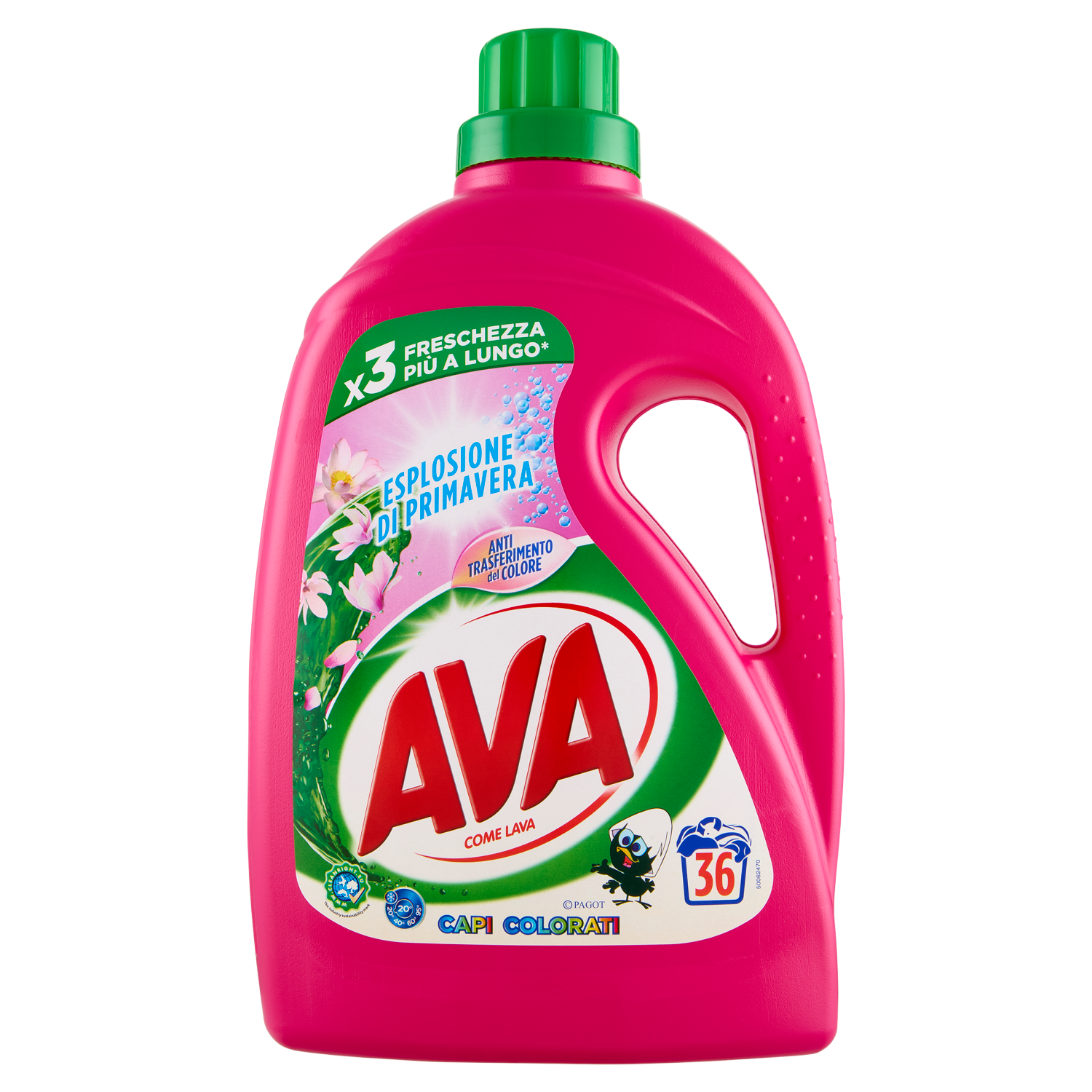 x3 Freschezza più a lungo* Ava Esplosione di Primavera regala una rivoluzionaria esperienza sensoriale di freschezza 3 volte più a lungo* grazie ad una attenta selezione di profumi floreali combinata con una tecnologia a rilascio graduale di fragranza. La sua speciale formulazione combina la forza pulente di Ava alla tecnologia anti trasferimento del colore per un bucato pulito e dai colori splendenti. *VS Lanza Brezza Mediterranea.