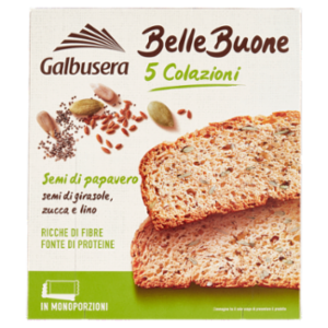 Le fette spesse per 5 Colazioni Belle, da gustare con gli occhi, prima ancora di assaporarle. Buone, perchè fatte con ingredienti genuini e di qualità. Dal gusto intenso e dalle consistenze diverse grazie all'impiego di farine poco raffinate e alle inclusioni di frutta intera o in pezzi e semi. Nuovo Pack -22% di Carta Il percorso salute Galbusera Garantiamo sempre Ricette studiate per un'alimentazione equilibrata. Oli e Grassi non Idrogenati, Alta Qualità materie Prime, Farina di Tipo 2 poco raffinata. Olio di girasole alto oleico. Sale marino integrale. No ogm, olio di palma, conservanti e coloranti. Ricche di grassi insaturi La sostituzione nella dieta dei grassi saturi con grassi insaturi contribuisce al mantenimento di livelli normali di colesterolo nel sangue. Un'alimentazione equilibrata ed una corretta attività fisica ti aiutano ad avere una vita sana. La tua colazione completa 1 monoporzione di BelleBuone latte o yogurt frutta fresca Per approfondimenti sulla Colazione completa vedi galbusera.it