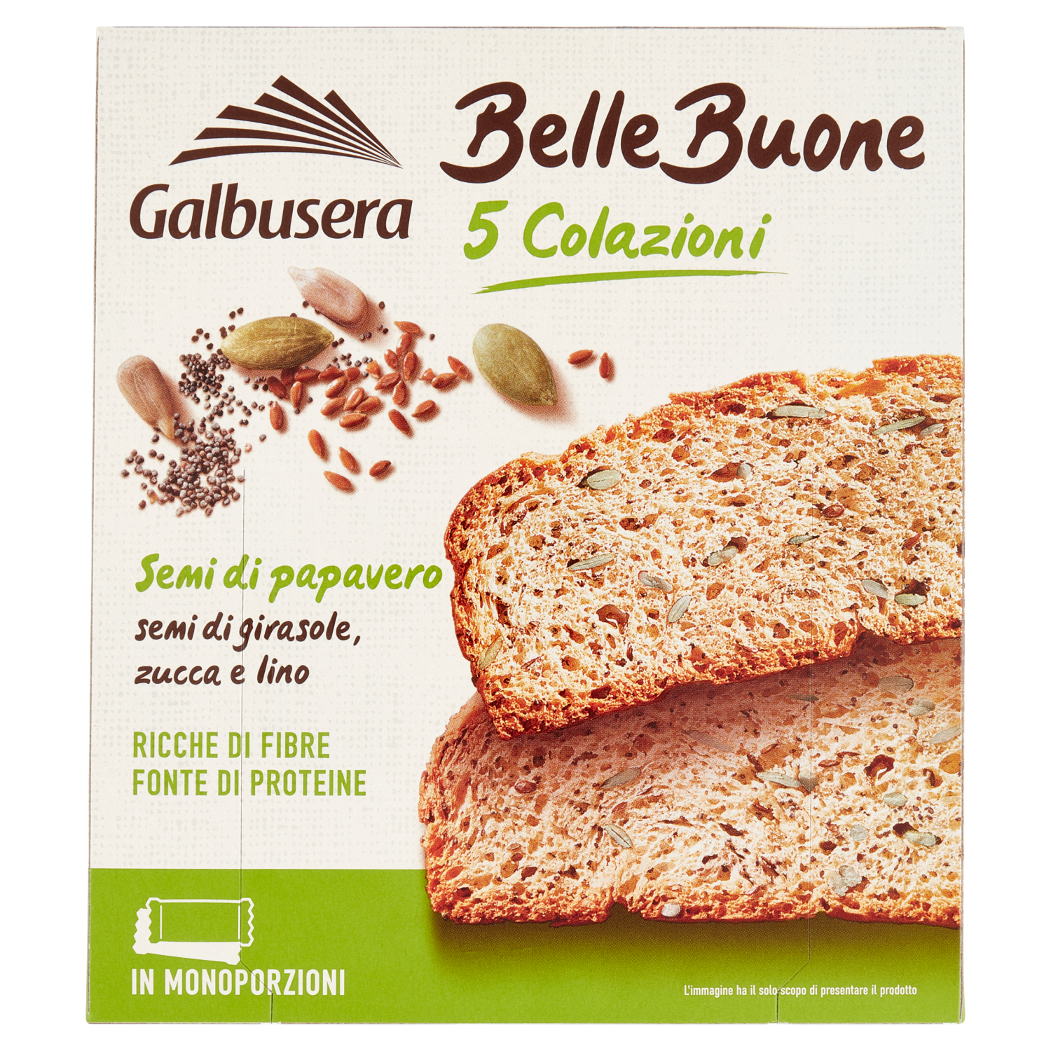 Le fette spesse per 5 Colazioni Belle, da gustare con gli occhi, prima ancora di assaporarle. Buone, perchè fatte con ingredienti genuini e di qualità. Dal gusto intenso e dalle consistenze diverse grazie all'impiego di farine poco raffinate e alle inclusioni di frutta intera o in pezzi e semi. Nuovo Pack -22% di Carta Il percorso salute Galbusera Garantiamo sempre Ricette studiate per un'alimentazione equilibrata. Oli e Grassi non Idrogenati, Alta Qualità materie Prime, Farina di Tipo 2 poco raffinata. Olio di girasole alto oleico. Sale marino integrale. No ogm, olio di palma, conservanti e coloranti. Ricche di grassi insaturi La sostituzione nella dieta dei grassi saturi con grassi insaturi contribuisce al mantenimento di livelli normali di colesterolo nel sangue. Un'alimentazione equilibrata ed una corretta attività fisica ti aiutano ad avere una vita sana. La tua colazione completa 1 monoporzione di BelleBuone latte o yogurt frutta fresca Per approfondimenti sulla Colazione completa vedi galbusera.it