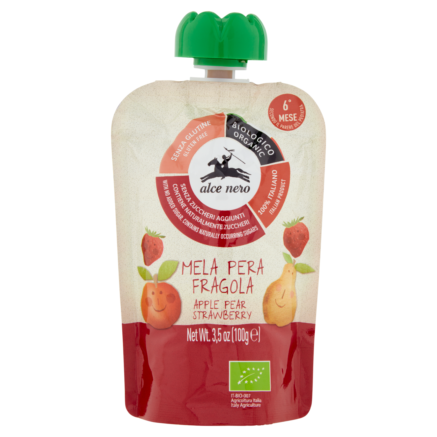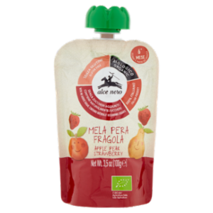 Purea biologica di mela, pera e fragola. Alimento per l'infanzia biologico a norma del D.P.R. n° 128 del 7 aprile 1999