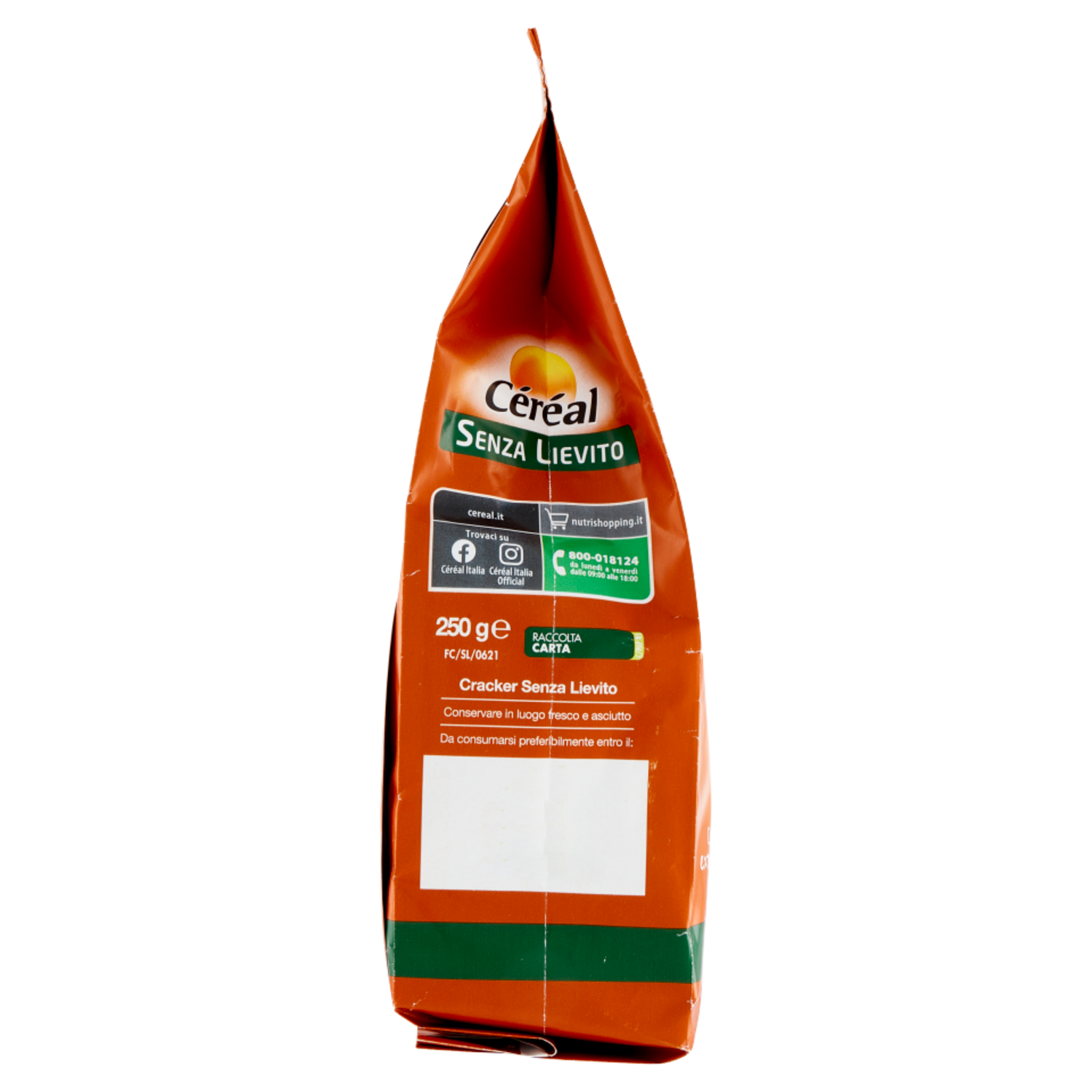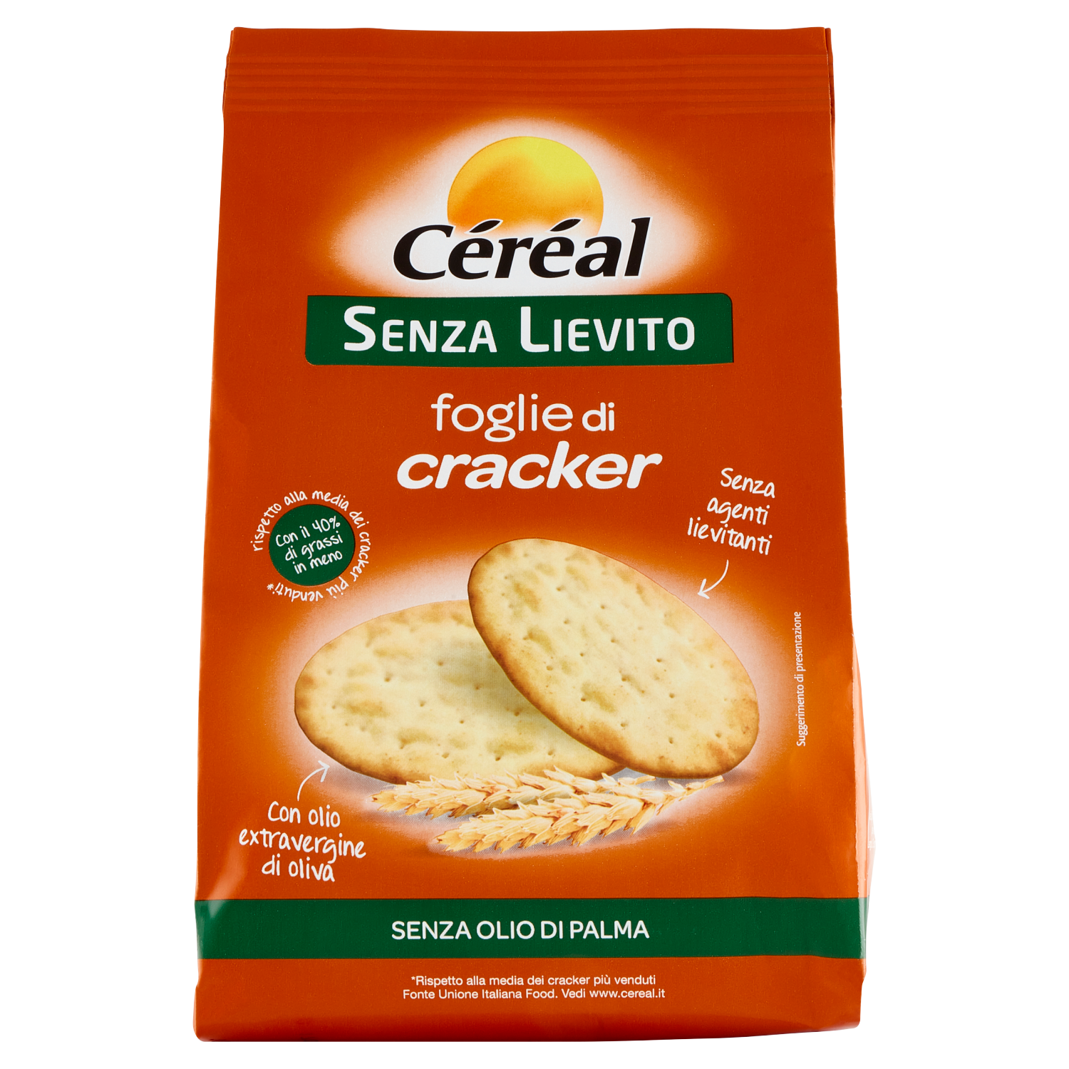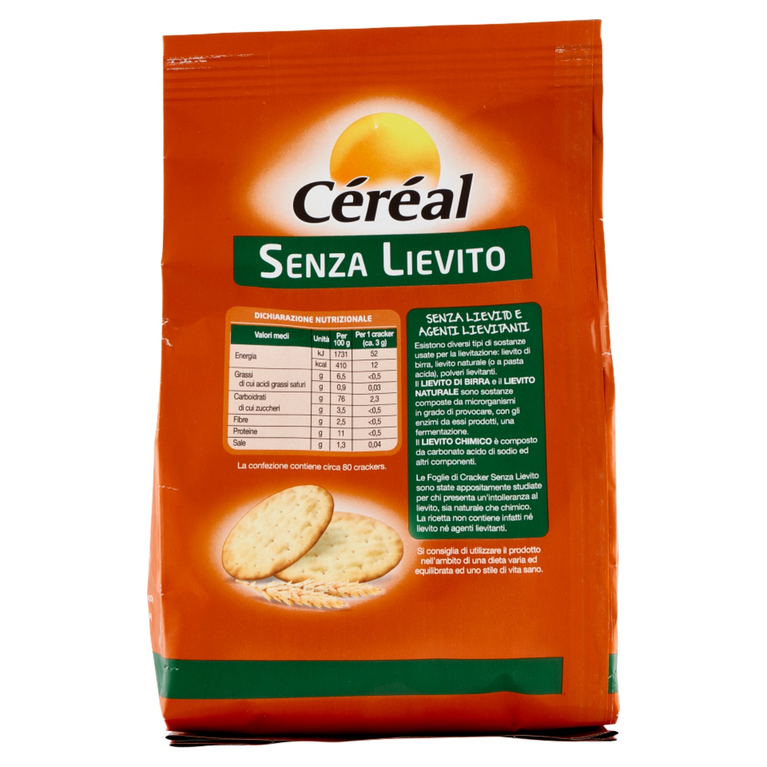 Senza lievito e agenti lievitanti Esistono diversi tipi di sostanze usate per la lievitazione: lievito di birra, lievito naturale (o a pasta acida), polveri lievitanti. Il Lievito di Birra e il Lievito Naturale sono sostanze composte da microrganismi in grado di provocare, con gli enzimi da essi prodotti, una fermentazione. Il Lievito Chimico è composto da carbonato acido di sodio ed altri componenti. Le Foglie di Cracker Senza Lievito sono state appositamente studiate per chi presenta un'intolleranza al lievito, sia naturale che chimico. La ricetta non contiene infatti né lievito né agenti lievitanti. Si consiglia di utilizzare il prodotto nell'ambito di una dieta varia ed equilibrata ed uno stile di vita sano. Céréal si impegna per voi Le Foglie di Cracker Senza Lievito Céréal sono prodotte con la massima cura: - senza lievito e agenti lievitanti - con il 40% di grassi in meno rispetto alla media dei cracker più venduti* - con olio extravergine di oliva - con ingredienti e metodi di produzione che garantiscono la naturalezza del prodotto *Rispetto alla media dei cracker più venduti Fonte Unione Italiana Food. Vedi www.cereal.it
