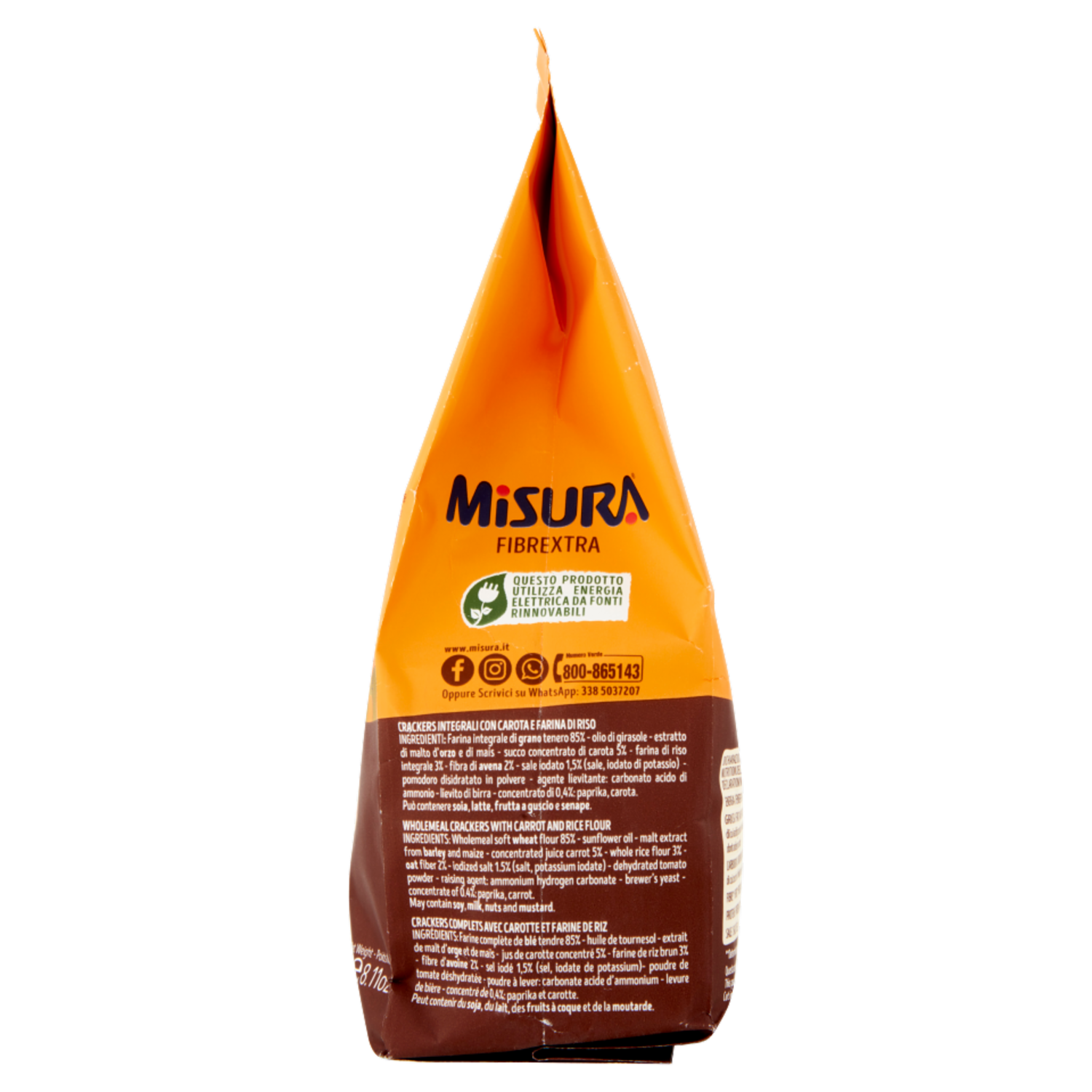 A Misura d'ambiente Filiera* 100% Italiana Il nostro grano è 100% italiano ed è sottoposto a rigorosi controlli. Proviene da sementi certificate all'origine, per la sicurezza di un prodotto di qualità. Tutto il processo produttivo è Tracciabile, dal seme al prodotto finito. confezione di Carta Certificata FSC Cosa Vuol Dire? La carta scelta per questo prodotto è Carta certificata FSC per una gestione responsabile delle foreste e degli ecosistemi. Contribuisci anche tu alla cura dell'ambiente. Scopri di più su www.misura.it. Fibrextra! Non il solito Integrale! 100% farina di frumento integrale proveniente da filiera italiana a cui si aggiunge il gusto autentico della carota. Un mix unico di tante fibre da verdura e cereali. E il colore? È dato Naturalmente dagli ingredienti utilizzati. Nessun Segreto, il buono è tutto qui! 13% di fibre Senza coloranti 60% di grassi saturi in meno rispetto alla media dei crackers più venduti (fonte: unioneitalianafood.it) Questo prodotto utilizza energia elettrica da fonti rinnovabili
