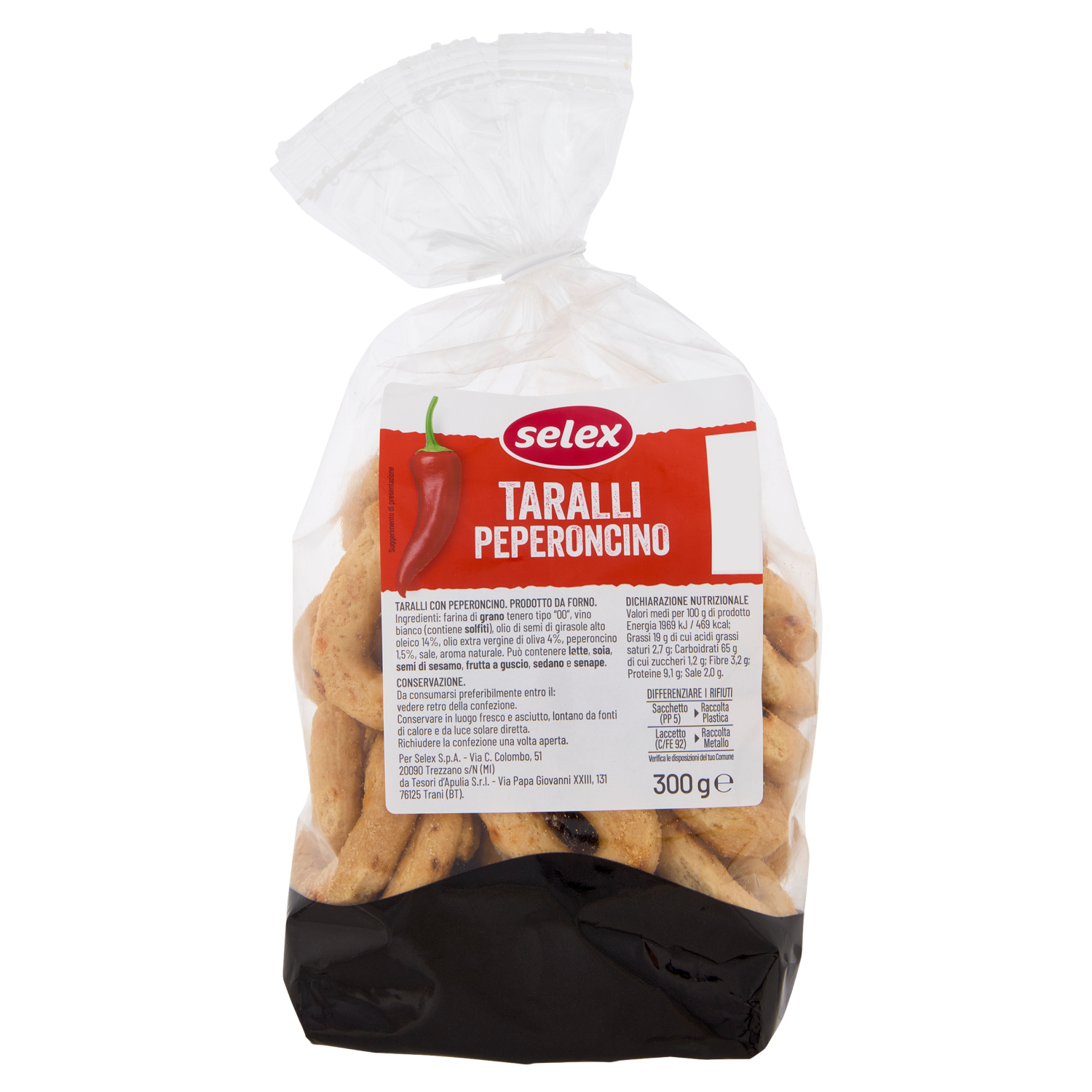 Taralli al peperoncino con olio di semi di girasole alto oleico 14% e olio extra vergine di oliva 4%. Prodotto da forno