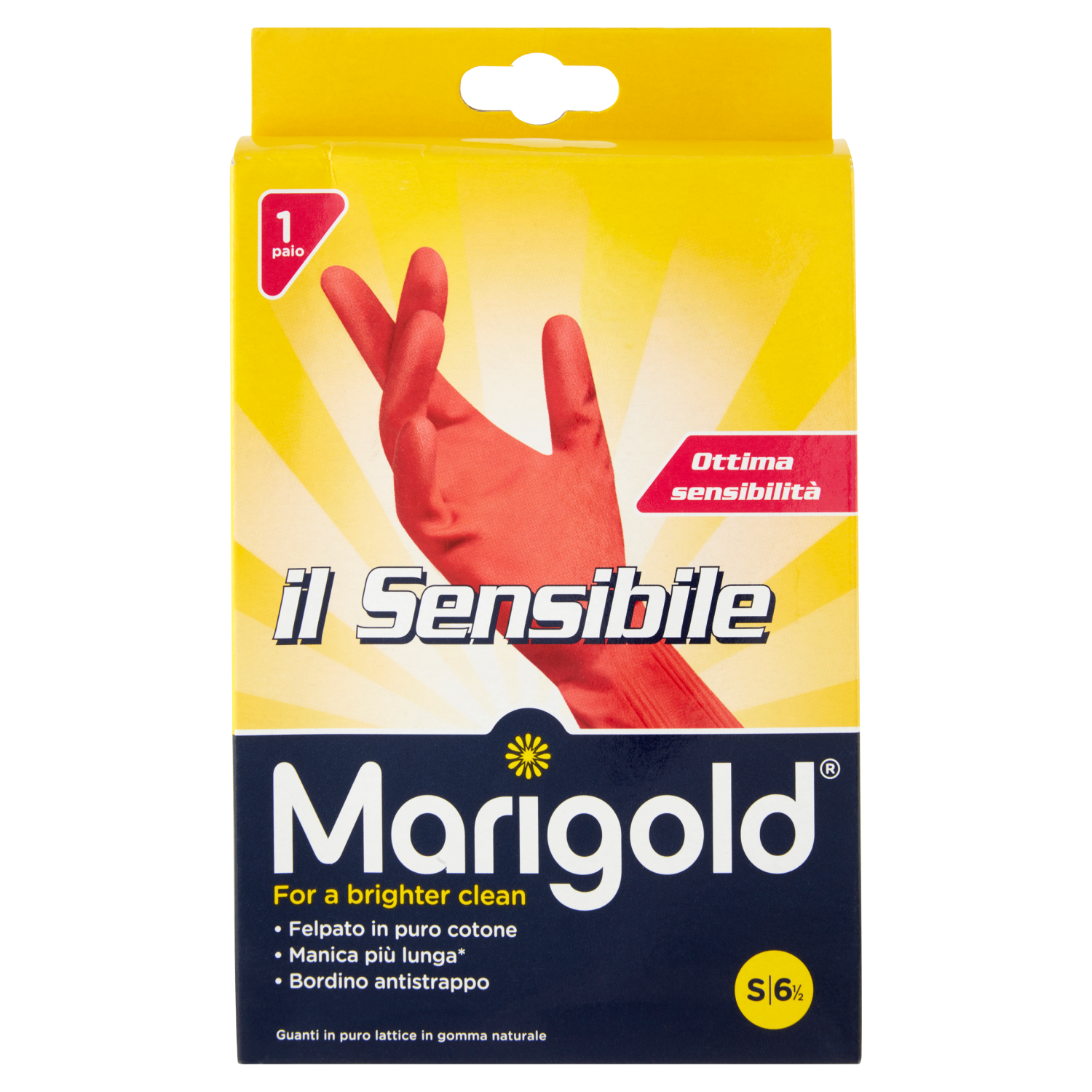 Marigold Il Sensibile è un guanto in puro lattice di gomma naturale, felpato in puro cotone, ideale per garantire un'ottima sensibilità. L'esclusiva manica lunga assicura una maggiore protezione durante i lavori domestici. 1 Ottima Sensibilità 2 Felpato in puro cotone 3 Bordino antistrappo