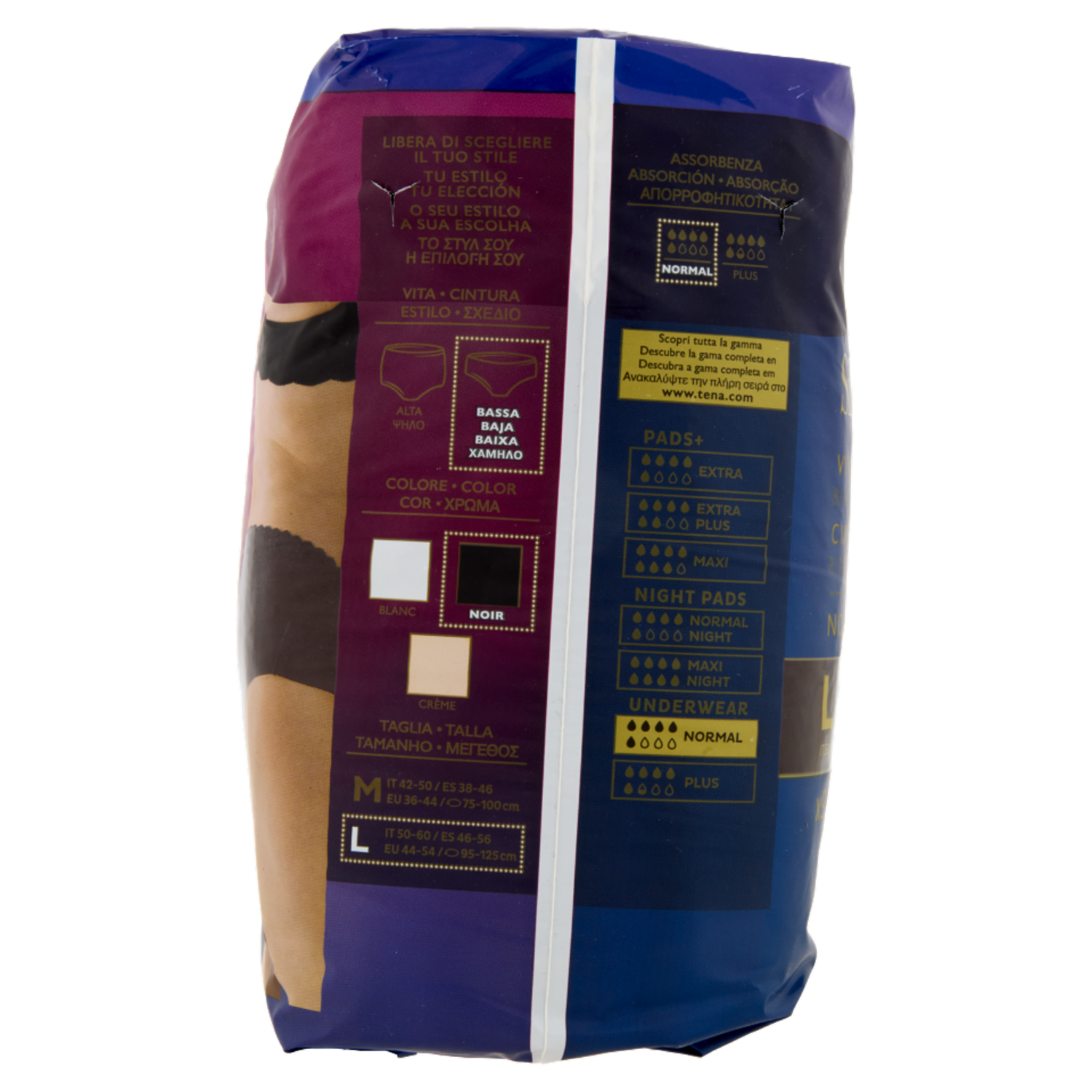 Libera di scegliere il tuo stile Vita: Alta | Bassa Colore: Blanc | Noir | Crème Taglia: M IT 42-50 / ES 38-46 / EU 36-44 | L IT 50-60 / ES 46-56 / EU 44-54 Assorbenza: 5 su 8 Normal | 5,5 su 8 Plus | 6 su 8 Night Scopri tutta la gamma www.tena.com Pads+ 4 su 8 Extra | 5 su 8 Extra plus | 5,5 su 8 Maxi Night Pads 2,5 su 8 Mini night | 6 su 8 Maxi night Underwear 5 su 8 Normal | 5,5 su 8 Plus | 6 su 8 Night