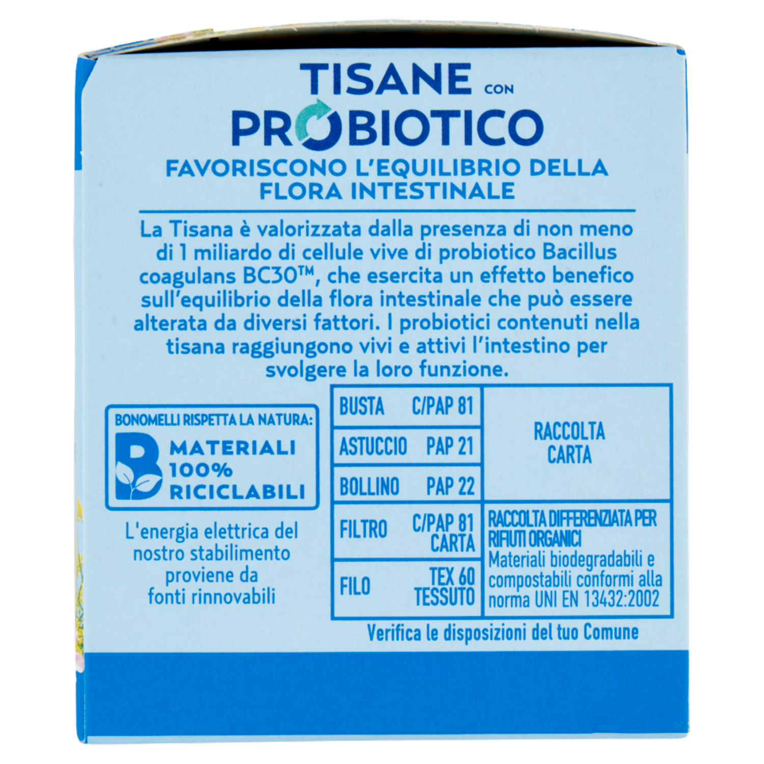 Favoriscono l'equilibrio della flora intestinale La Tisana è valorizzata dalla presenza di non meno di 1 miliardo di cellule vive di probiotico Bacillus coagulans BC30, che esercita un effetto benefico sull'equilibrio della flora intestinale che può essere alterata da diversi fattori. I probiotici contenuti nella tisana raggiungono vivi e attivi l'intestino per svolgere la loro funzione. Con Finocchio, Anice e Carvi, che favoriscono la regolare motilità gastrointestinale e l'eliminazione dei gas
