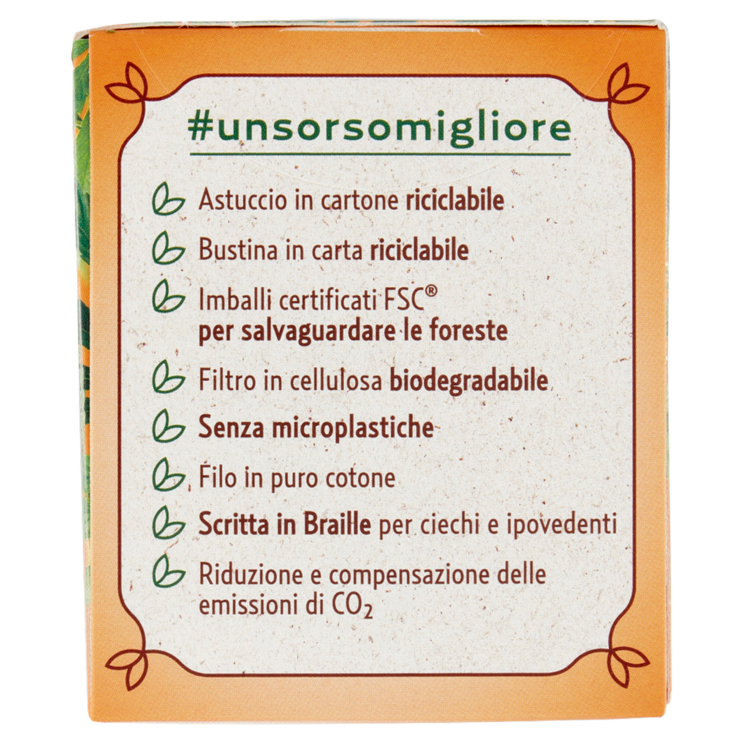 #unsorsomigliore - Astuccio in cartone riciclabile - Bustina in carta riciclabile - Imballi certificati FSC per salvaguardare le foreste - Filtro in cellulosa biodegradabile - Senza microplastiche - Filo in puro cotone - Scritta in Braille per ciechi e ipovedenti - Riduzione e compensazione delle emissioni di CO₂ Le gustose fave di cacao e l'arancia, abbinate all'olio di canapa, ottenuto dalla spremitura dei suoi semi, danno vita ad un infuso piacevole e distensivo. La Cannabis sativa, originaria dell'Asia centrale, è una pianta storicamente diffusa in Occidente. Questo infuso, naturalmente privo di caffeina, è ideale per chi avverte il bisogno di una pausa rilassante. Questo prodotto è naturalmente senza glutine e adatto ad una dieta vegana.