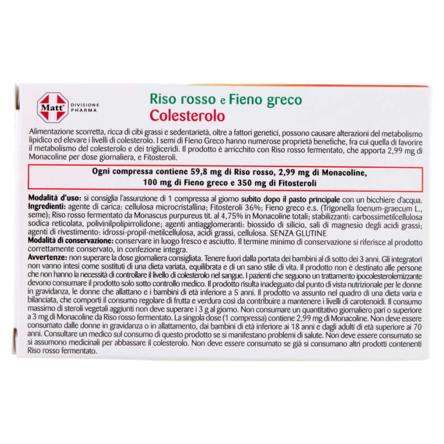 Avvertenze: non superare la dose giornaliera consigliata. Tenere fuori dalla portata dei bambini al di sotto dei 3 anni. Gli integratori non vanno intesi come sostituti di una dieta variata, equilibrata e di un sano stile di vita. Il prodotto non è destinato alle persone che non hanno la necessità di controllare il livello di colesterolo nel sangue. I pazienti che seguono un trattamento ipocolesterolemizzante devono consumare il prodotto solo sotto controllo medico. Il prodotto risulta inadeguato dal punto di vista nutrizionale per le donne in gravidanza, le donne che allattano e i bambini di età inferiore a 5 anni. Il prodotto va assunto nel quadro di una dieta varia e bilanciata, che comporti il consumo regolare di frutta e verdura così da contribuire a mantenere i livelli di carotenoidi. Il consumo massimo di steroli vegetali aggiunti non deve superare i 3 g al giorno. Non consumare un quantitativo giornaliero pari o superiore a 3 mg di Monacoline da Riso rosso fermentato. La singola dose (2 compresse) contiene 2,76 mg di Monacoline. Non deve essere consumato dalle donne in gravidanza o in allattamento, dai bambini di età inferiore ai 18 anni e dagli adulti di età superiore ai 70 anni. Consultare un medico sul consumo di questo prodotto se si manifestano problemi di salute. Non deve essere consumato se si assumono medicinali per abbassare il colesterolo. Non deve essere consumato se già si consumano altri prodotti contenenti Riso rosso fermentato. L'effetto benefico sul colesterolo si ottiene con l'assunzione giornaliera di almeno 0,8 g di Fitosteroli.
