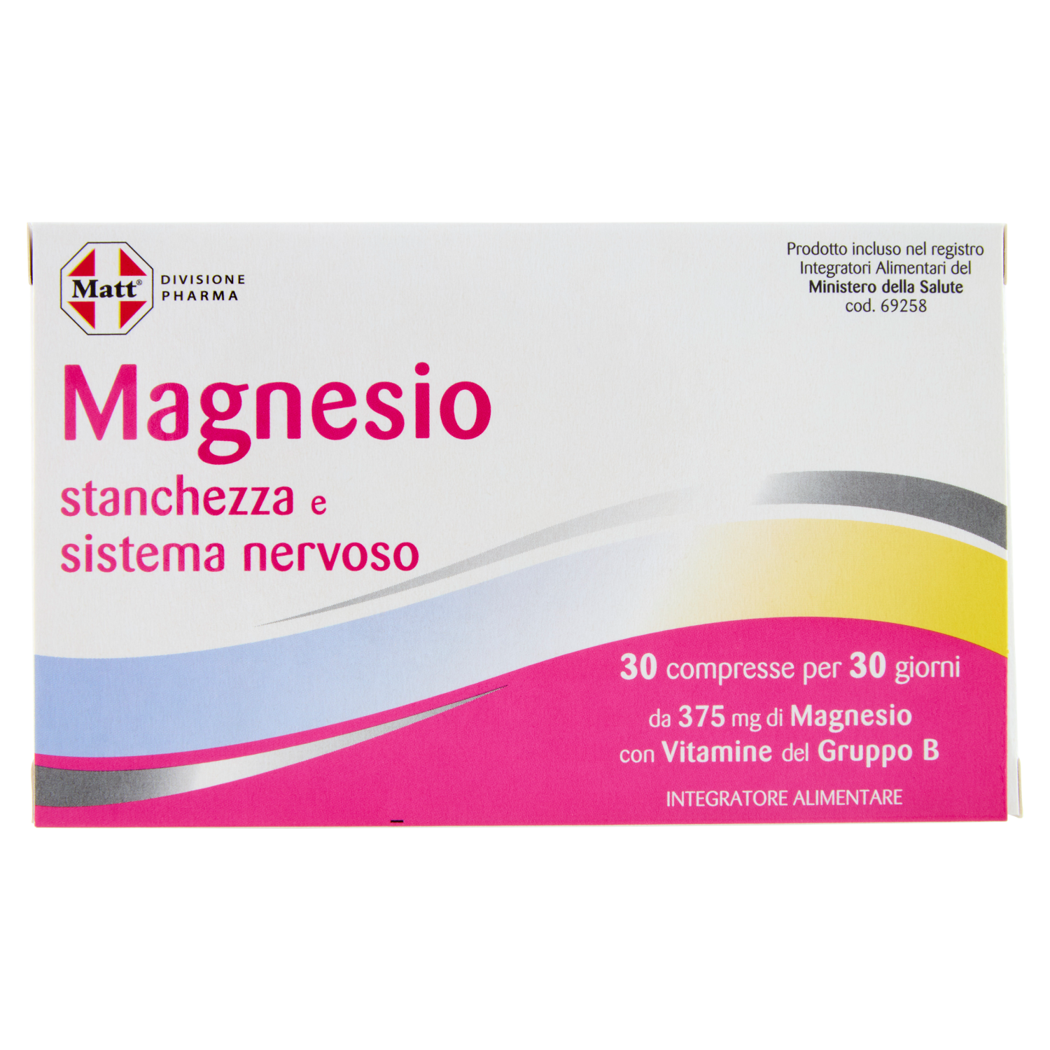 Un'alimentazione poco equilibrata, povera di alimenti ricchi in Magnesio, può provocare una carenza di questo prezioso minerale. Il Magnesio contribuisce alla riduzione della stanchezza e dell'affaticamento, al normale funzionamento del sistema nervoso, alla normale funzione psicologica e muscolare, al mantenimento di ossa e denti normali. Il prodotto è arricchito con Vitamina B3 e Vitamina B1 che, insieme al Magnesio, contribuiscono al normale metabolismo energetico. Magnesio con Vitamine del gruppo B è utile per apportare una quota integrativa di tali nutrienti. Ogni compressa contiene 375 mg di Magnesio e Vitamine del Gruppo B
