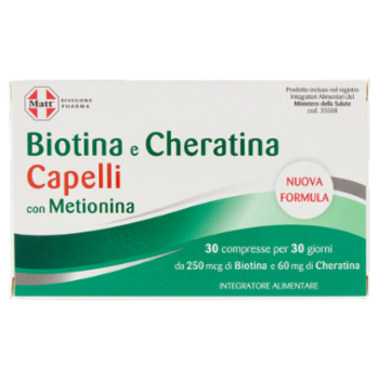 Metionina e Biotina retard Capelli è un integratore alimentare di Metionina, Vitamine e Minerali a rilascio prolungato (azione retard). La Metionina entra a far parte della struttura della cheratina, sostanza fondamentale di capelli e unghie. La Biotina, insieme allo Zinco, contribuisce al mantenimento di capelli normali. Il Rame contribuisce alla normale pigmentazione dei capelli. Le Vitamine ne arricchiscono la formulazione. Ogni compressa contiene 300 mg di Metionina e 100 mcg di Biotina