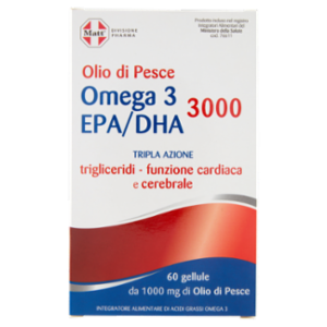 Olio di Pesce Omega 3 EPA/DHA 3000 è un integratore alimentare che apporta acidi grassi polinsaturi della serie Omega 3 (EPA/DHA). Gli acidi grassi EPA/DHA contribuiscono alla normale funzione cardiaca, al mantenimento di livelli normali di trigliceridi nel sangue e di una normale pressione sanguigna. II DHA contribuisce al mantenimento della normale funzione cerebrale. Olio di Pesce Omega 3 EPA/DHA 3000 apporta quantitativi di EPA/DHA tali da poter selezionare il dosaggio in base al beneficio ricercato. Ogni gellula contiene 1000 mg di Olio di Pesce di cui 313 mg di EPA e 209 mg di DHA