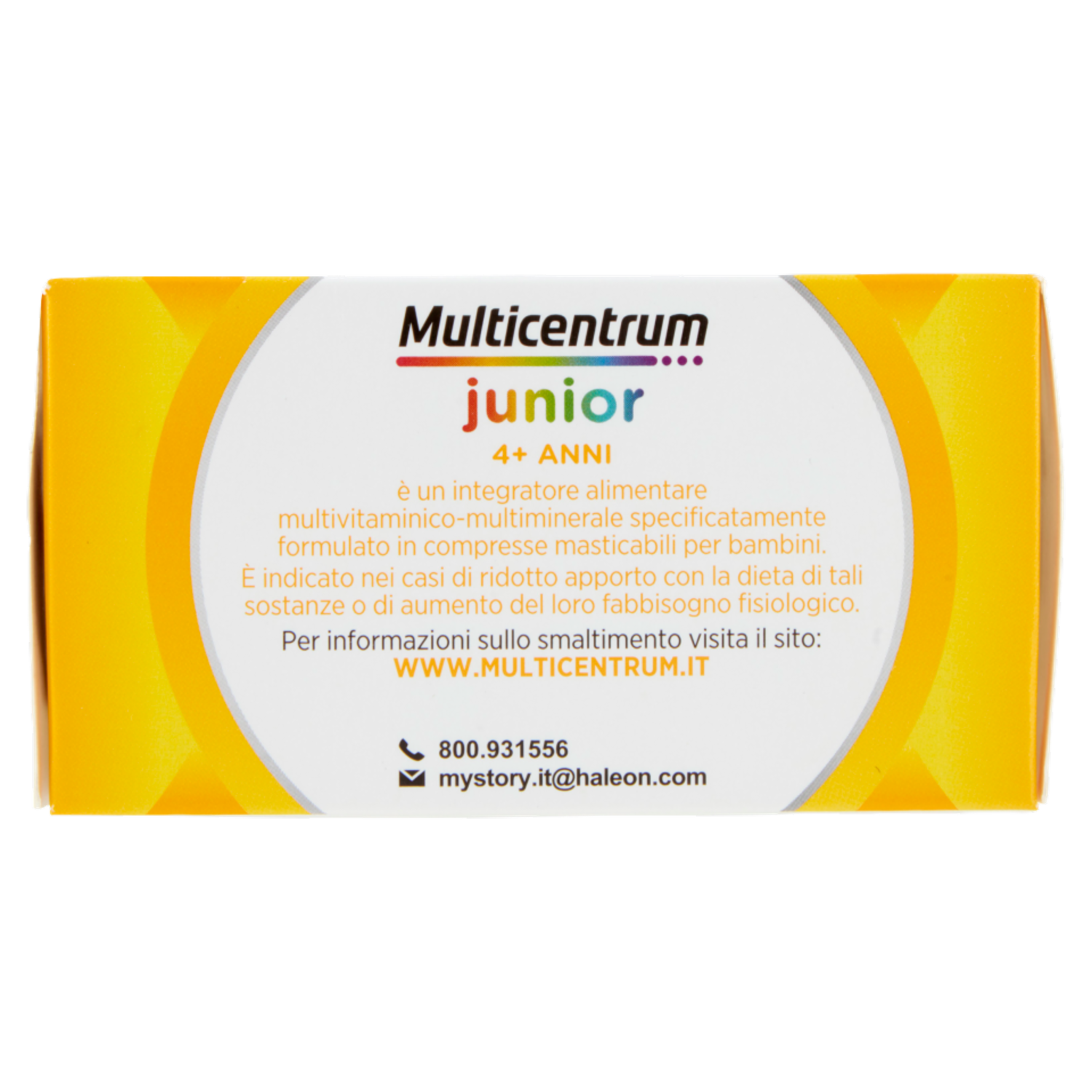 Senza glutine Senza zuccheri Completo dalla A allo Zinco Contiene Vitamina B1 (Tiamina) che contribuisce al normale metabolismo energetico Integratore specificatamente formulato per bambini da 4 anni in su, con livelli bilanciati di Vitamine E Minerali tra cui Vitamina D e Ferro Con Ferro che contribuisce al normale sviluppo cognitivo dei bambini Contiene Vitamina D necessaria per la normale crescita e sviluppo delle ossa nei bambini Multicentrum junior 4+ Anni è un integratore alimentare multivitaminico-multiminerale specificatamente formulato in compresse masticabili per bambini. È indicato nei casi di ridotto apporto con la dieta di tali sostanze o di aumento del loro fabbisogno fisiologico.