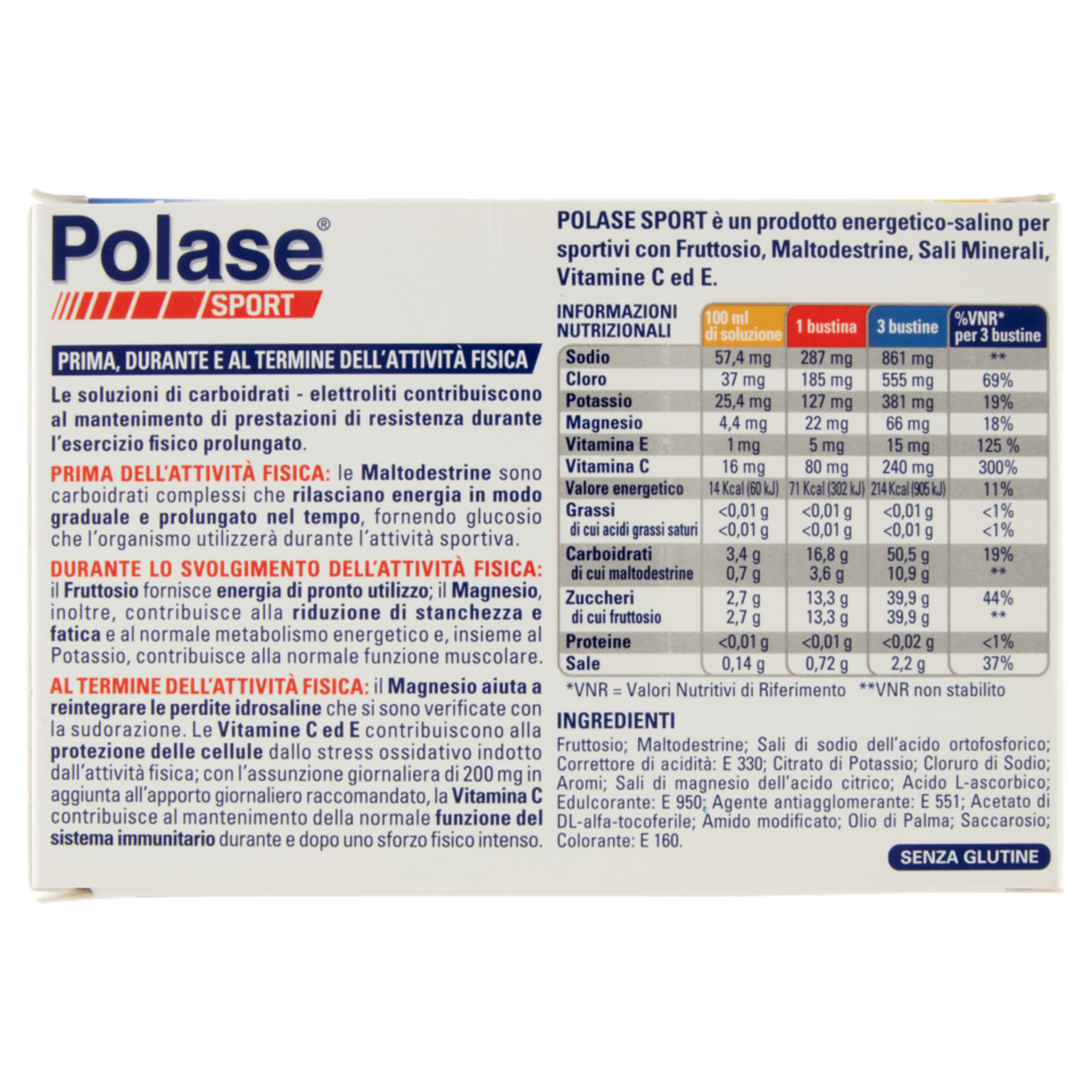 Polase Sport è un prodotto energetico-salino per sportivi con Fruttosio, Maltodestrine, Sali Minerali, Vitamine C ed E. Prima, durante e al termine dell'attività fisica Le soluzioni di carboidrati - elettroliti contribuiscono al mantenimento di prestazioni di resistenza durante l'esercizio fisico prolungato. Prima dell'Attività Fisica: le Maltodestrine sono carboidrati complessi che rilasciano energia in modo graduale e prolungato nel tempo, fornendo glucosio che l'organismo utilizzerà durante l'attività sportiva. Durante lo Svolgimento dell'Attività Fisica: il Fruttosio fornisce energia di pronto utilizzo; il Magnesio, inoltre, contribuisce alla riduzione di stanchezza e fatica e al normale metabolismo energetico e, insieme al Potassio, contribuisce alla normale funzione muscolare. Al Termine dell'Attività Fisica: il Magnesio aiuta a reintegrare le perdite idrosaline che si sono verificate con la sudorazione. Le Vitamine C ed E contribuiscono alla protezione delle cellule dallo stress ossidativo indotto dall'attività fisica; con l'assunzione giornaliera di 200 mg in aggiunta all'apporto giornaliero raccomandato, la vitamina C contribuisce al mantenimento della normale funzione del sistema immunitario durante e dopo uno sforzo fisico intenso. Sali organici - Elevato assorbimento Polase Sport contiene sali organici di Potassio e Magnesio, che grazie alla loro elevata solubilità sono sali altamente assimilabili dall'organismo.