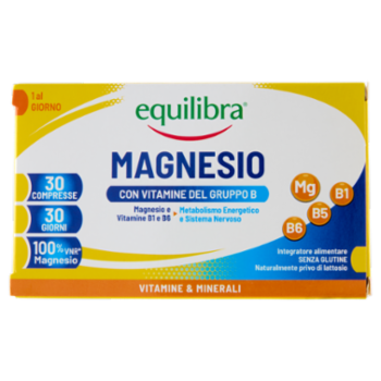 Integratore alimentare a base di Magnesio con vitamine del gruppo B. Il Magnesio può risultare utile per il mantenimento di ossa e denti normali, ed in associazione con le vitamine B1, B5 e B6 contribuisce al normale metabolismo energetico dell'organismo; magnesio e acido pantotenico (Vitamina B5) inoltre aiutano a ridurre stanchezza e affaticamento, mentre le vitamine B1 e B6 contribuiscono al normale funzionamento del sistema nervoso. I vantaggi delle compresse Equilibra studia attentamente i propri prodotti: oltre all'accurata scelta delle materie prime ricerca i veicoli migliori per rendere gli ingredienti funzionali rapidamente ed efficacemente disponibili per l'organismo, per offrire ai propri consumatori il miglior standard qualitativo possibile. Le compresse prive di coloranti consentono di avere un prodotto ad alta concentrazione.