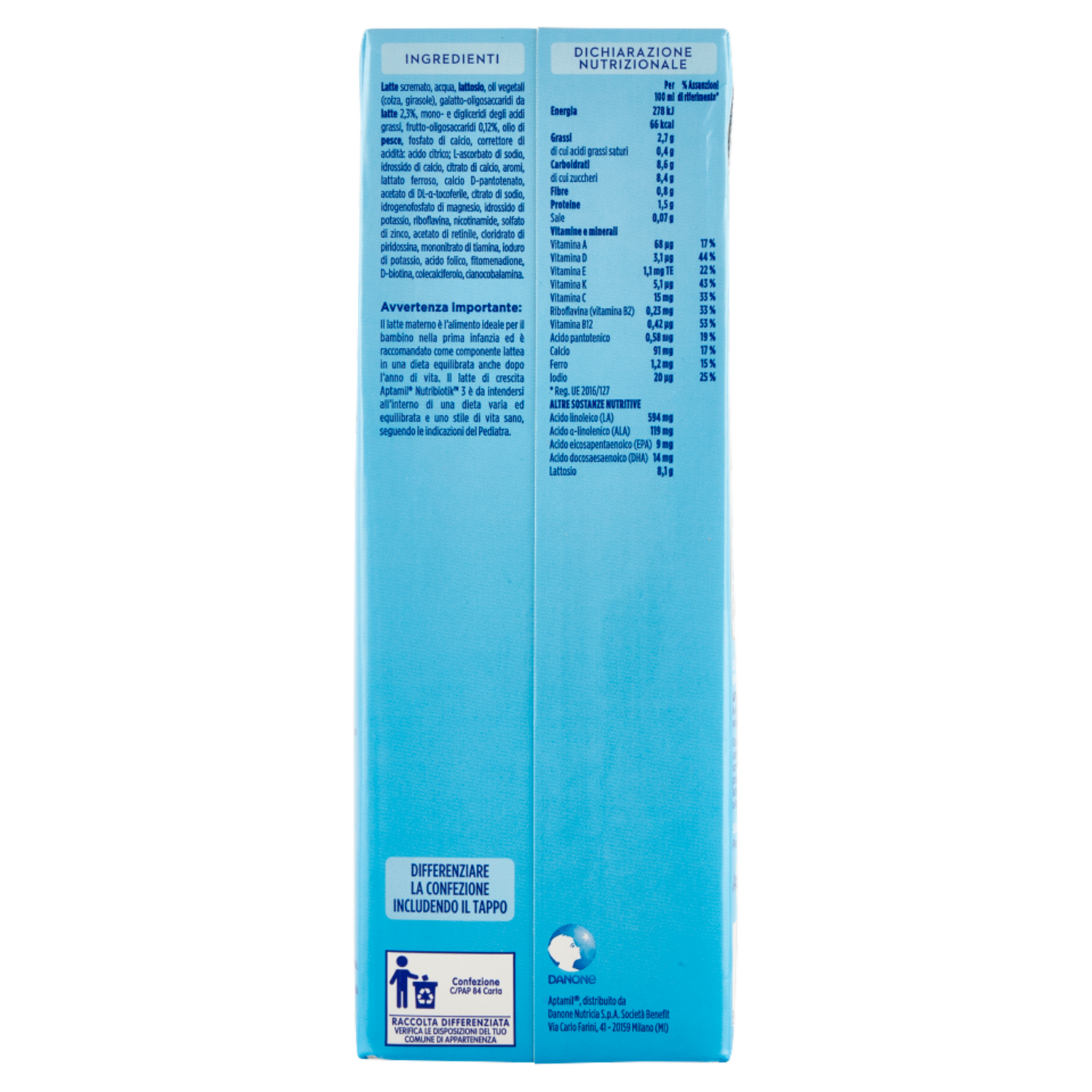 Avvertenza Importante: Il latte materno è l'alimento ideale per il bambino nella prima infanzia ed è raccomandato come componente lattea in una dieta equilibrata anche dopo l'anno di vita. Il latte di crescita Aptamil Nutribiotik 3 è da intendersi all'interno di una dieta varia ed equilibrata ed uno stile di vita sano, seguendo le indicazioni del Pediatra. Il tappo che non cade** 1 Alza per parire 2 Premi per chiudere **Come richiesto dalla direttiva europea 904/2019 Come preparare il latte per il tuo bambino Dose giornaliera indicativa: ogni tazza di Latte Crescita (240 ml circa) apporta una quantità significativa di vitamina C, vitamina D e calcio. Avvertenza: seguire con cura le indicazioni; una preparazione e modalità di conservazione inadeguate potrebbero comportare un rischio per la salute del bambino. 1 Prima della preparazione, lavarsi le mani ed assicurarsi che la parte superiore della confezione sia pulita. 2 Non bollire: il prodotto è già sterile, già pronto per essere consumato a temperatura ambiente o scaldato a circa 40 °C. 3 Agitare prima dell'uso. 4 Consumare entro un'ora dalla preparazione. 5 Non riutilizzare l'eventuale latte avanzato.