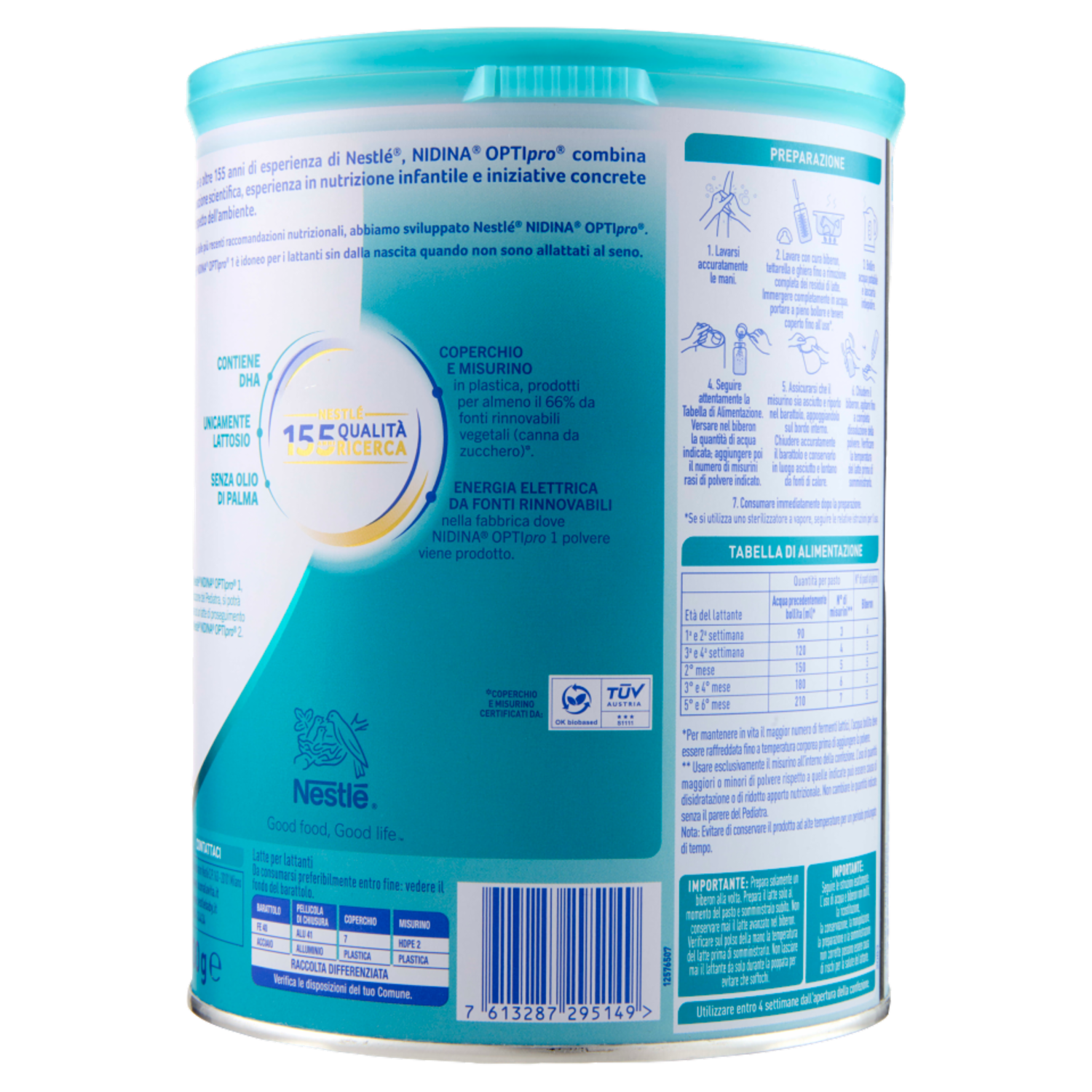 Grazie a oltre 155 anni di esperienza di NESTLÉ, NIDINA OPTIPRO combina innovazione scientifica, esperienza in nutrizione infantile e iniziative concrete nel rispetto dell'ambiente. Guidati dalle più recenti raccomandazioni nutrizionali, abbiamo sviluppato NESTLÉ, NIDINA OPTIPRO. NESTLÉ, NIDINA OPTIPRO 1 è idoneo per i lattanti sin dalla nascita quando non sono allattati al seno. Nestlé 155 - Qualità - Ricerca - Contiene DHA - Unicamente lattosio - Senza olio di palma - Coperchio e Misurino in plastica, prodotti per almeno il 66% da fonti rinnovabili vegetali (canna da zucchero)°. - Energia Elettrica da Fonti Rinnovabili nella fabbrica dove NIDINA OPTIPRO 1 polvere viene prodotto. °Coperchio e misurino certificati da: TŪV Austria - S1111 Dopo NESTLÉ NIDINA OPTIPRO 1, su indicazione del Pediatra, si potrà passare ad un latte di proseguimento come NESTLÉ NIDINA OPTIPRO 2. - Nuova formula - Coperchio e misurino in plastica - Prodotti per almeno il 66% da Fonti Rinnovabili Vegetali° - Contiene DHA* - Unicamente lattosio - °Coperchio e misurino certificati da: TŪV Austria - S1111 - *come prescritto dalla legge per tutte le formule per lattanti