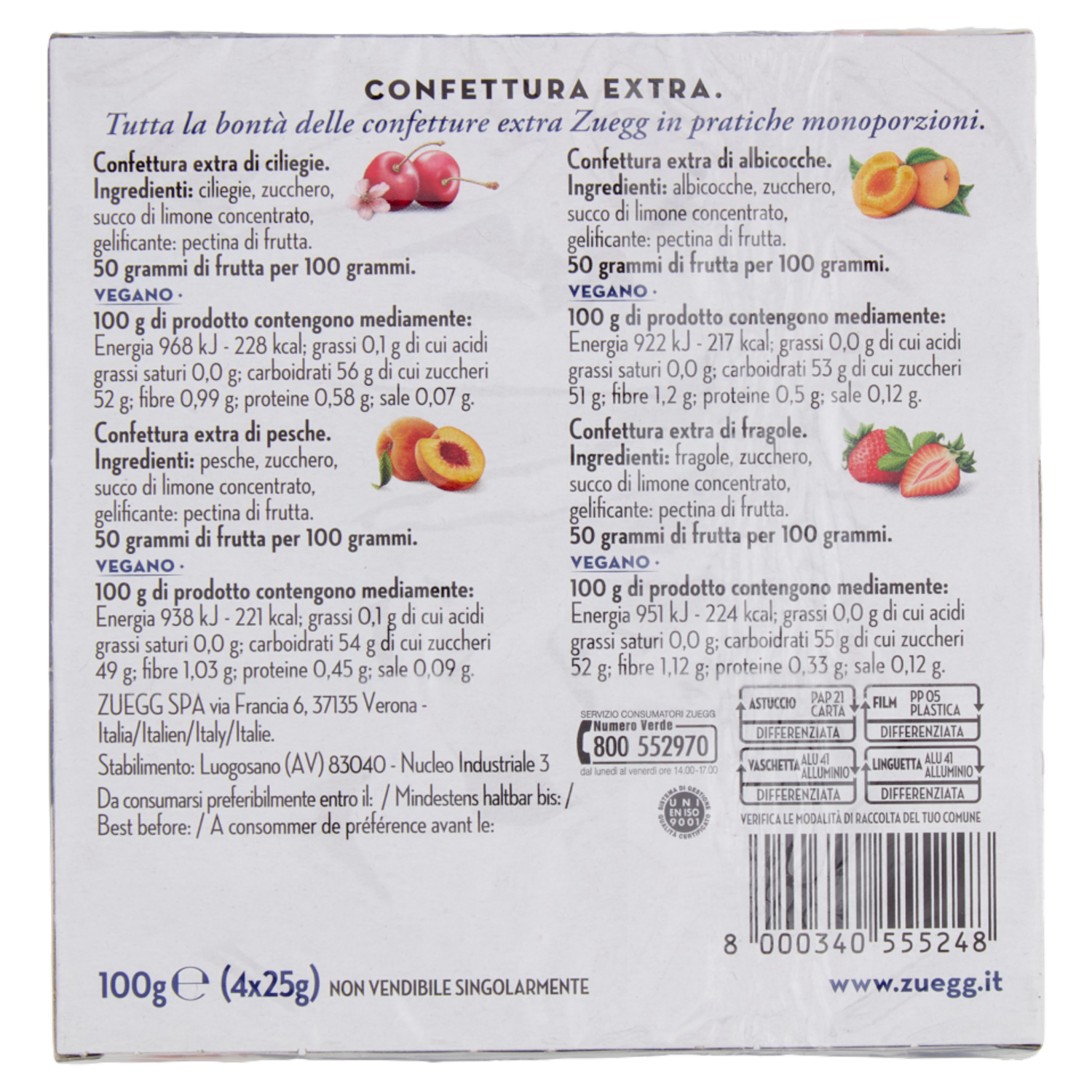 Tutta la bontà delle confetture extra Zuegg in pratiche monoporzioni. Vegano.