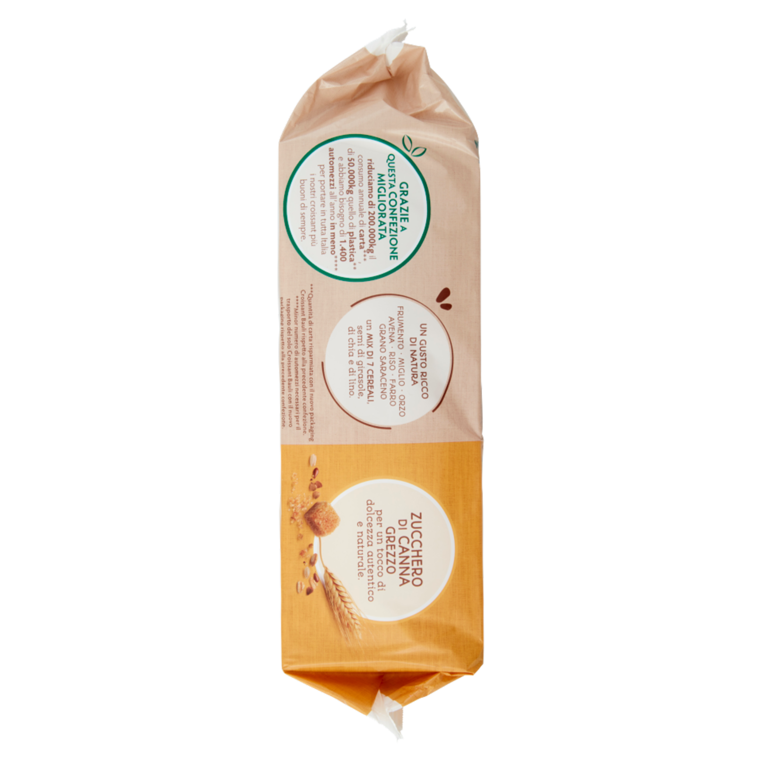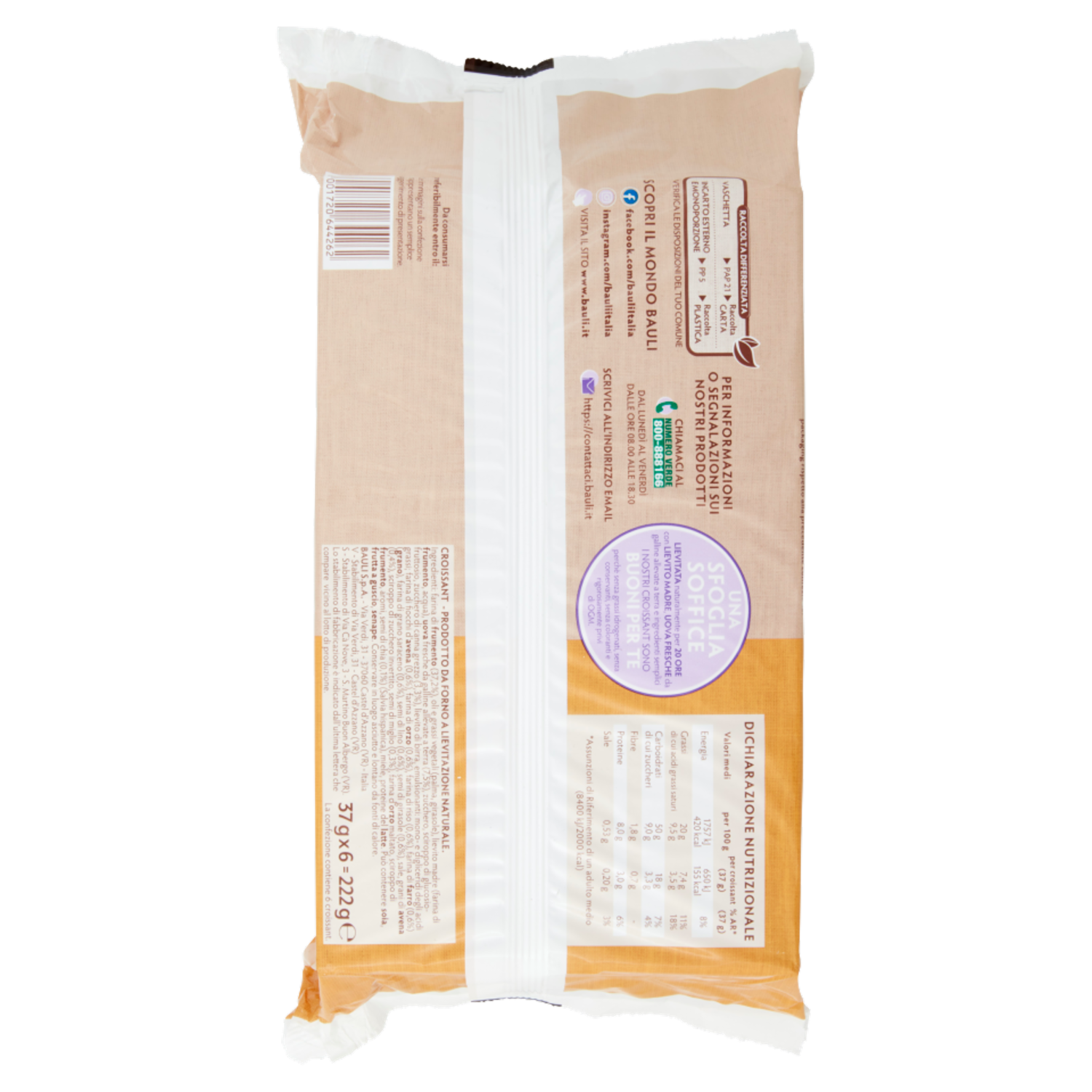 Una Sfoglia Soffice Lievitata naturalmente per 20 Ore con Lievito Madre, Uova Fresche da galline allevate a terra e ingredienti semplici I Nostri Croissant Sono Buoni Per Te perchè senza grassi idrogenati, senza conservanti, senza coloranti e rigorosamente privi di OGM. Grazie a Questa Confezione Migliorata riduciamo di 200.000kg il consumo annuale di carta***, di 50.000kg quello di plastica** e abbiamo bisogno di 1.400 automezzi all'anno in meno**** per portare in tutta Italia i nostri croissant più buoni di sempre. Un gusto ricco di natura Frumento - Miglio - Orzo - Avena - Riso - Farro - Grano Saraceno - un Mix di 7 Cereali, semi di girasole, di chia e di lino. Zucchero di Canna Grezzo per un tocco di dolcezza autentico e naturale. **Quantità di plastica risparmiata con il nuovo packaging Croissant Bauli rispetto alla precedente confezione ***Quantità di carta risparmiata con il nuovo packaging Croissant Bauli rispetto alla precedente confezione. ****Minor numero di automezzi necessari per il trasporto del solo Croissant Bauli con il nuovo packaging rispetto alla precedente confezione.